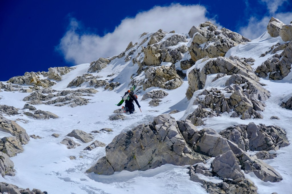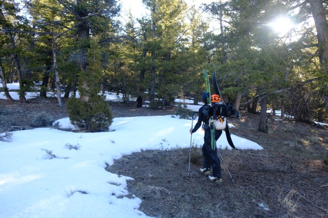 The summit was incredibly beautiful, a narrow, shark fin strip of snow with extreme vertical relief on either side. We sat down for a leisurely lunch before poking around the south and north side of the mountain, looking for either of the two couloirs Drew scouted. Unfortunately, the South Couloir looked as scantily clad as the West Face and North couloir. Opting for our ascent route strictly out of familiarity, we began the arduous descent, skis on packs, to the bottom of the West Face. True reality of ski mountaineering #3: Sometimes you don’t even get to ski. From the base of the West Face we decided to ski north into an uncertain but promising north facing bowl. I dropped first, making a few excellent powder turns and pulling up on an outcropping to scout the rollover below. Cliffs. Big cliffs. True reality of ski mountaineering #4: Sometimes you ski up to an unavoidable cliff band, and have to boot-pack the trail of shame back to where you started. We continued to retrace our steps until eventually finding a visibly continuous north facing line into the valley below. Judging by my turns on the face before, we expected 2000 feet of soft skiing to the drainage. What we recieved was exactly the opposite. The “snow” was a harrowing and nearly un-skiable punch crust, much like parking an incredibly thin sheet of ice on a few inches of sugar, on a solid base of rocks. True reality of ski mountaineering #5: Sometimes you climb for hours to ski the worst snow of your life.