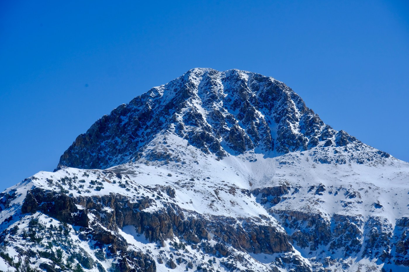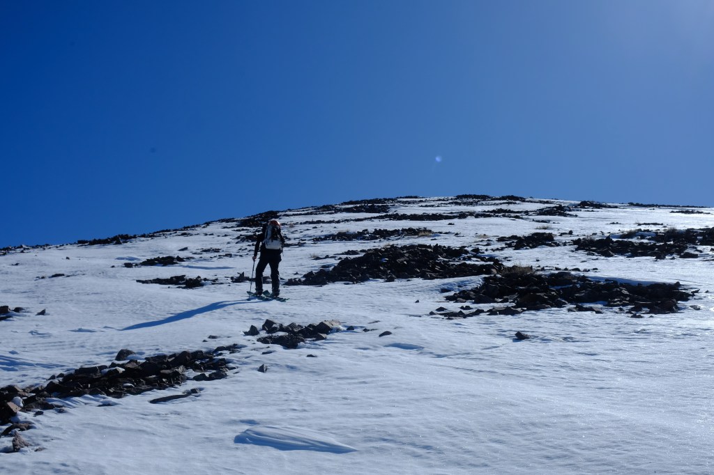 After a steep initial push the west ridge turns to a gentle slope, providing a long but relatively easy approach through thick pines. Bear tracks littered the snow and dirt alike, criss-crossing our path and keeping us on guard. Some trenches were absolutely massive, suggesting the furry creatures of the Lemhi might be larger than those of Teton origin. Eventually we transitioned to skis, at which time I carelessly slipped on a patch of ice, wrenching my knee while trying to recover balance. Luckily, my locked out binding eventually submitted to the pressure, releasing the toe my boot just before irreperable damage could be done. Nonetheless, the pain was throbbing as I regained my composure and came to my feet. True reality of ski mountaineering #1: Approaches often take much longer than estimated, and often include slipping on refrozen snow, trudging through a breakable crust and occasionally walking on dirt trails with large, hungry bears lurking nearby, carrying your skis.