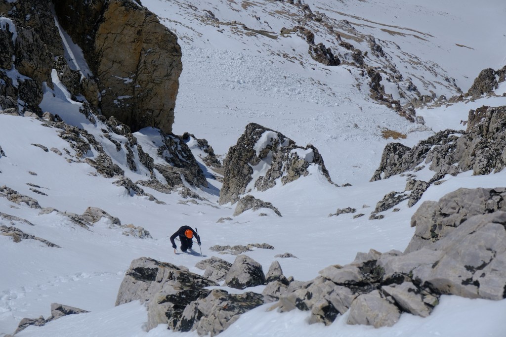 I continued along slowly, taking care not to repeat the incident, and occasioanlly switching to walking for added traction. After roughly two hours of monkeying along a well featured ridge we finally reached the base of West Face, staring directly up three obvious summit couloirs. On the face, which was positioned perfectly to bake in the afternoon sun, the snowpack ranged from a scant six inches to a hardly more encouraging foot. Implementing ice axes, we booted directly up the ridge, moved into the couloir and continued connecting patches of snow towards the summit. Reconvening at the halfway point in a uniquely a uniquely steep spot, I heard a “click” from up ahead. I turned my head just in time to see Drew’s splitboard binding bounce right past me and into the chute below, careening off rock walls and tumbling several hundred feet. True reality of ski mountaineering #2: Well, I don’t have a concrete statement to put here, but I lost a ski in the Southwest Couloir of the Middle Teton a month ago after it ejected prematurely and rocketed off a cliff, and once left an ice axe at the base of Mount Wister. Point is, you never, ever, ever know what is going to happen in the mountains, and it’s often best to expect the unexpected.