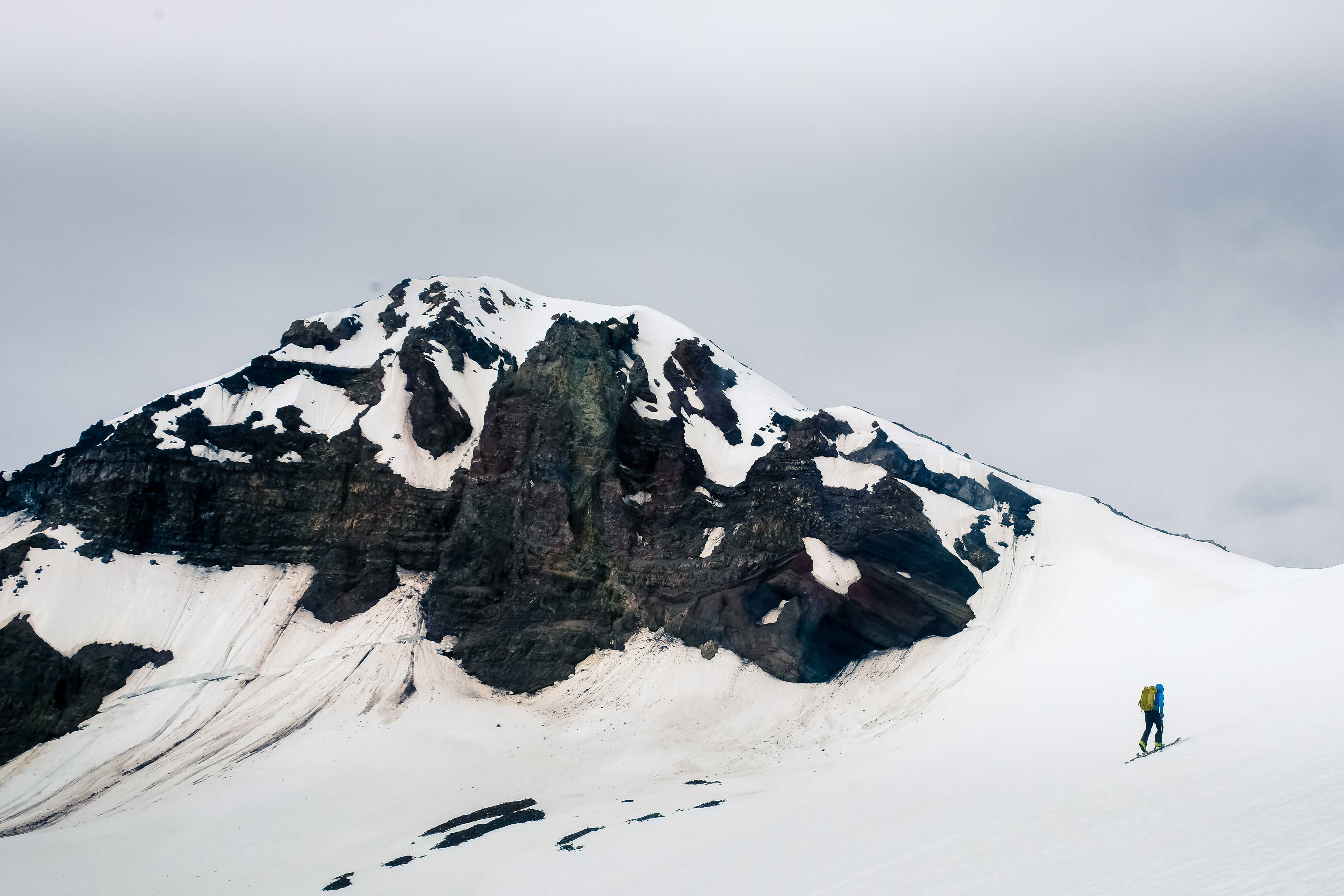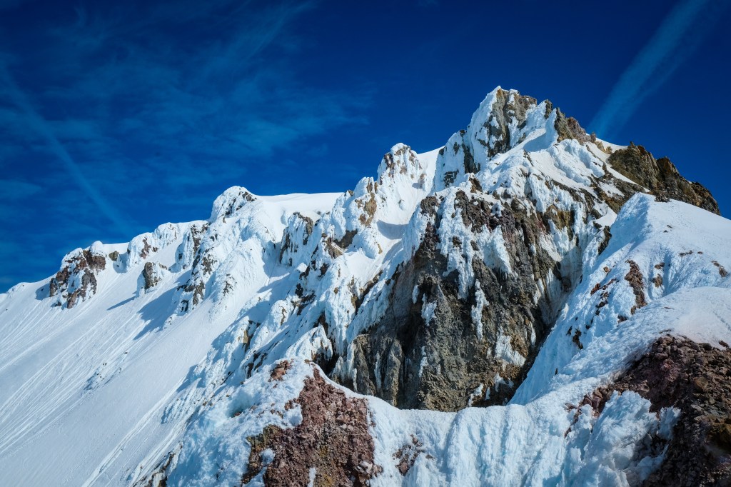 My approach started just after 6:00 from a very muddy Mount Hood Meadows base area. While lifts typically run well into summer, the COVID-19 pandemic spontaneously decapitated the season, leaving the parking lot and resort infrastructure a bare-bones scene of maintenance vehicles and abandoned chairlifts. With no snow in sight, I began my day trudging up service roads and winter trails until reaching the snowline about 1,000 feet above. As I would come to appreciate later on, climbing Cascade volcanoes is much more straightforward, both mentally and literally, than my home Tetons. Instead of connecting a multitude of canyons, couloirs and ridges to reach a pointy and often obscured summit, Mount Hood, as well as every other peak I would ski on this trip, showed its might loud and clear. Route finding absent, I watched the hours tick by as the Newton-Clark Glacier and my ascent route, the Wy’East Snowfield, caught their first glimpses of morning light. Following an old bootpack I kicked steps into the 40 degree Wy’East, meandering my way to the summit ridge without much trouble. Besides two skiers following a modest ways behind, I was alone on the world’s second-most climbed climbed mountain, a very rare experience. Opposite the Newton Clark was a guided party of six and one solo-skier on Mount Hood’s standard climbing climbing route, the South Crater. However, with Hood being so expansive, I wouldn’t see either party for the rest of the day. A short traverse climber’s right took me to the top of the Newton-Clark, where I stared skeptically at a precarious roll-over that seemed to drop endlessly into the abyss below. Having scouted the line from the car, I was confident of the route’s ski-ability, but nonetheless struggled to push the damning idea of tumbling over hidden cliffs from my mind. I arrived just after 9:00, and with the snow still plenty firm ditched my pack and attempted to climb the final short, rocky and definitely un-skiable pitch to the true summit. To my disappointment, the route wasn’t in proper shape for ascent without rope, partner and gear. The leftmost variant was ice glazed choss and the right solar mush (I plunged waist deep through unconsolidated snow just beneath the summit ridge), and with both offering highly consequential exposure I proudly swallowed ego for life. The crowning jewel of Mount Hood skiing was waiting just below, so no regrets harbored as I retreated to my skis and clicked in for the “most aesthetically enjoyable descent” on one of North America’s most famous volcanoes.
