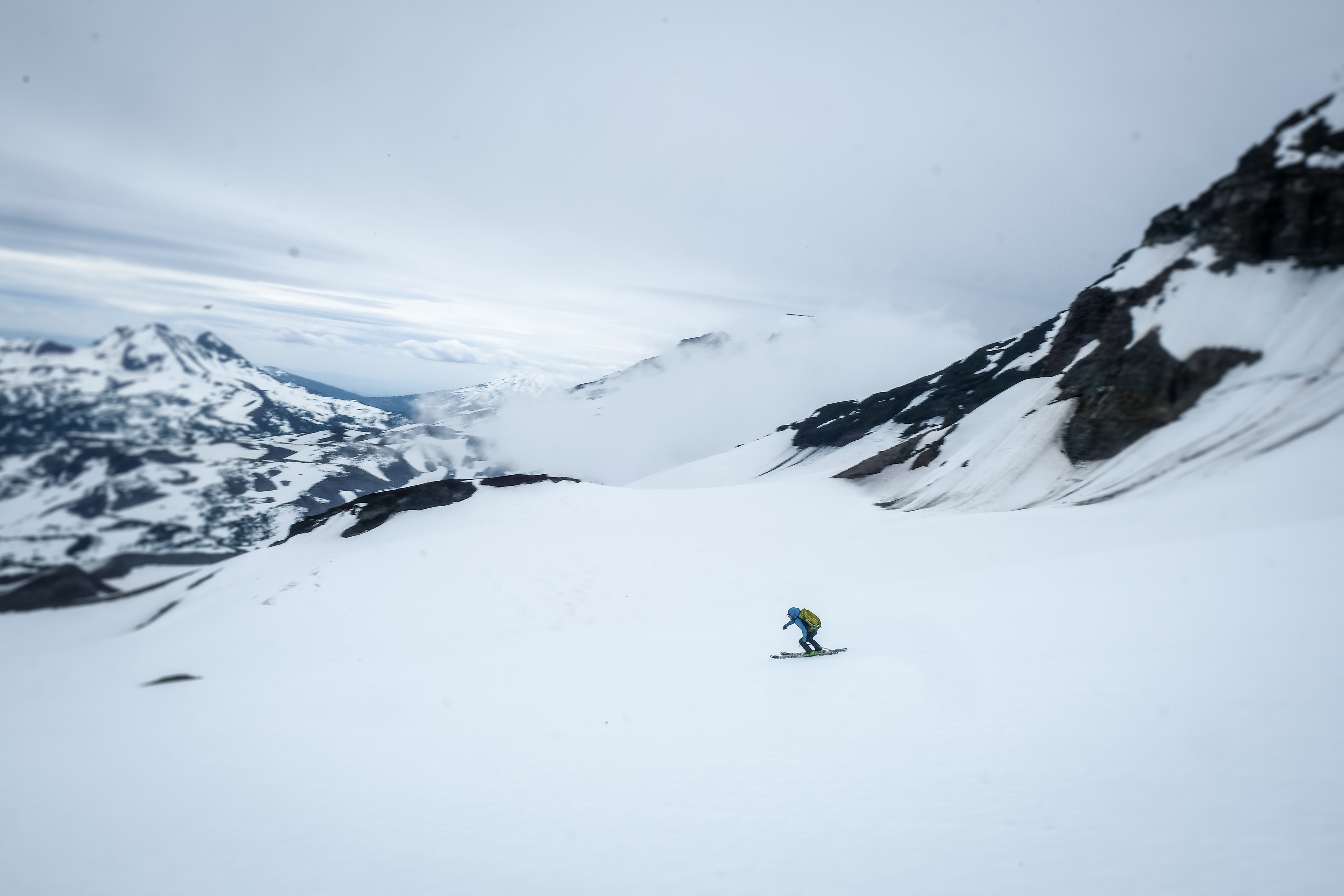 Topping out on the Middle Sister was a unique experience. Four other prominent volcanic peaks stood in close proximity, and a strong wind coupled with newly clouded skies added an air of suspense. Haunted by injury for the last eight months, Bryce’s enthusiasm alone was enough to distract me from our unfavorable ski descent ahead. His gratitude shone loud and clear, setting the tone for a fiasco of technical jump turns on icy terrain. In good conditions, the north face of the Middle Sister would be a tremendous descent, but for us it was a delicate game of “don’t fall” and “slow n’ steady.” Growing up on the East Coast, conditions like these are common fare, so while I’m never excited to tackle a firm head-wall, I also never feel out of my element. With the steep pitches behind us, we re-grouped at the saddle and continued to mob a steady 2,000 feet of sun-softened corn back to our tracks below. Dipping and diving off ridges and jibbing any feature we could find, the low-angle terrain of the Three Sisters basin transported me to memories of closing day resort skiing, warm, free-flowing and carefree as can be.