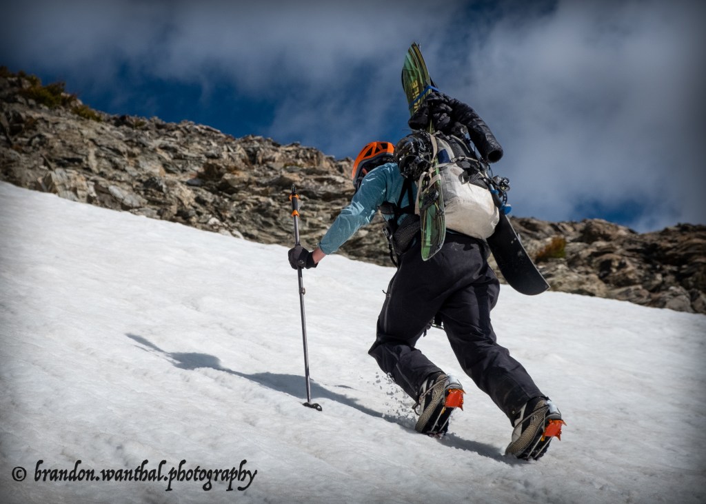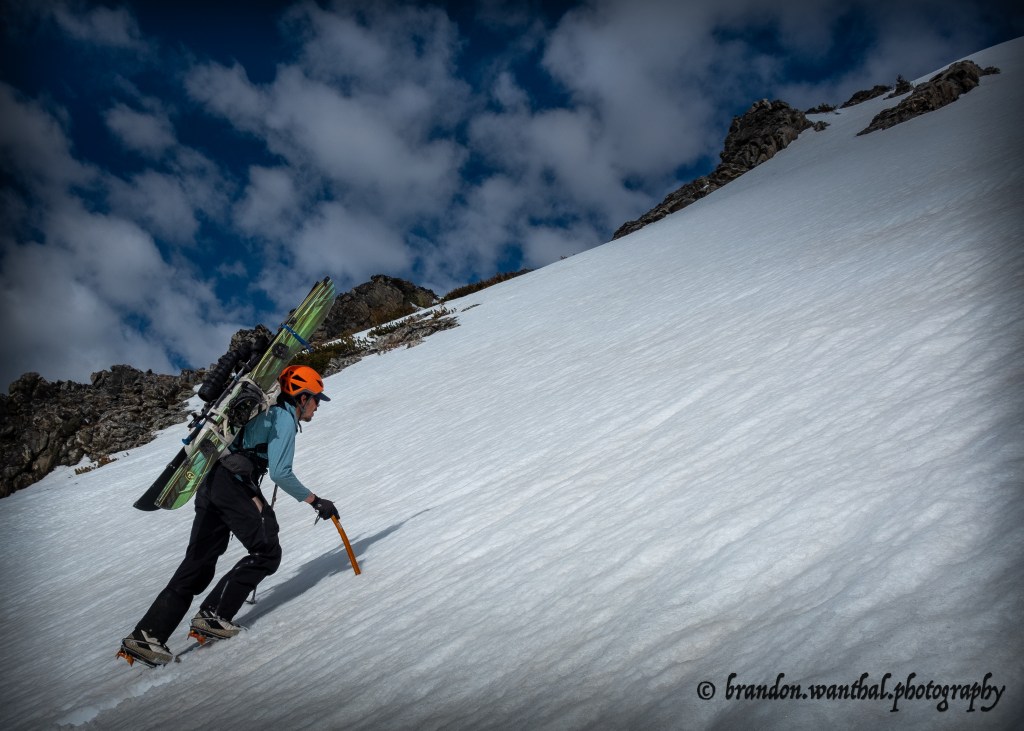 No rock or ice gear is needed for the South or East Faces of Static Peak. A light duty aluminum ice axe and a likewise set of crampons would be in my pack no matter the season. I would also bring ski crampons for firm conditions or anytime after early spring.
