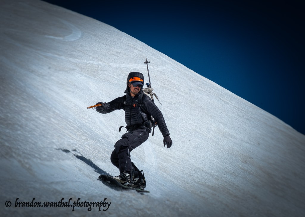 Booting the East Face took less than an hour, but even before 9:00AM the snow was beginning to soften. We climbed the path of least resistance, straight up the line we intended to ski. By the top we were kicking boot-deep steps into rotten snow – time to pick up the pace. Luckily, a chilling wind swirled on the summit keeping the conditions firm enough to allow snacks and pictures. I never get tired of this summit. Views to the north of Buck, The Grand Teton, Nez Perce and Teewinot dominate the sky and remind of how small we actually are. After a quick tri-pod session it was back to the skis. Beneath a beautiful bluebird sky we cranked turns on the firm upper face, which softened gradually the lower we went. We negotiated a few rotten cliff areas but mostly enjoyed perfect supportable corn for a party-style descent to our break spot below. Satisfied by perfect turns amidst epic Teton scenery, of which we had all to ourselves, we plunked down on a rock to enjoy sandwiches and tea before making our way back to reality.