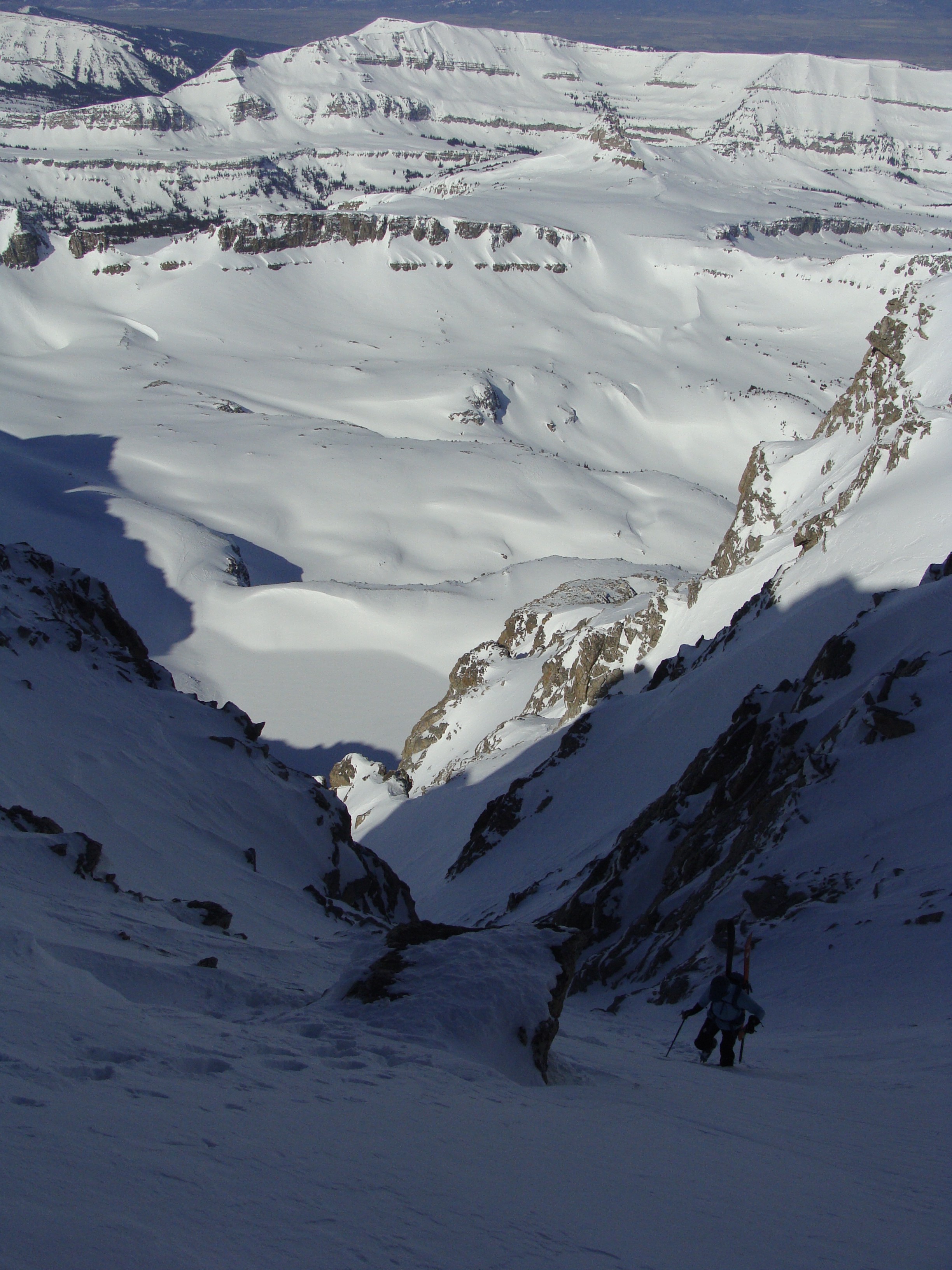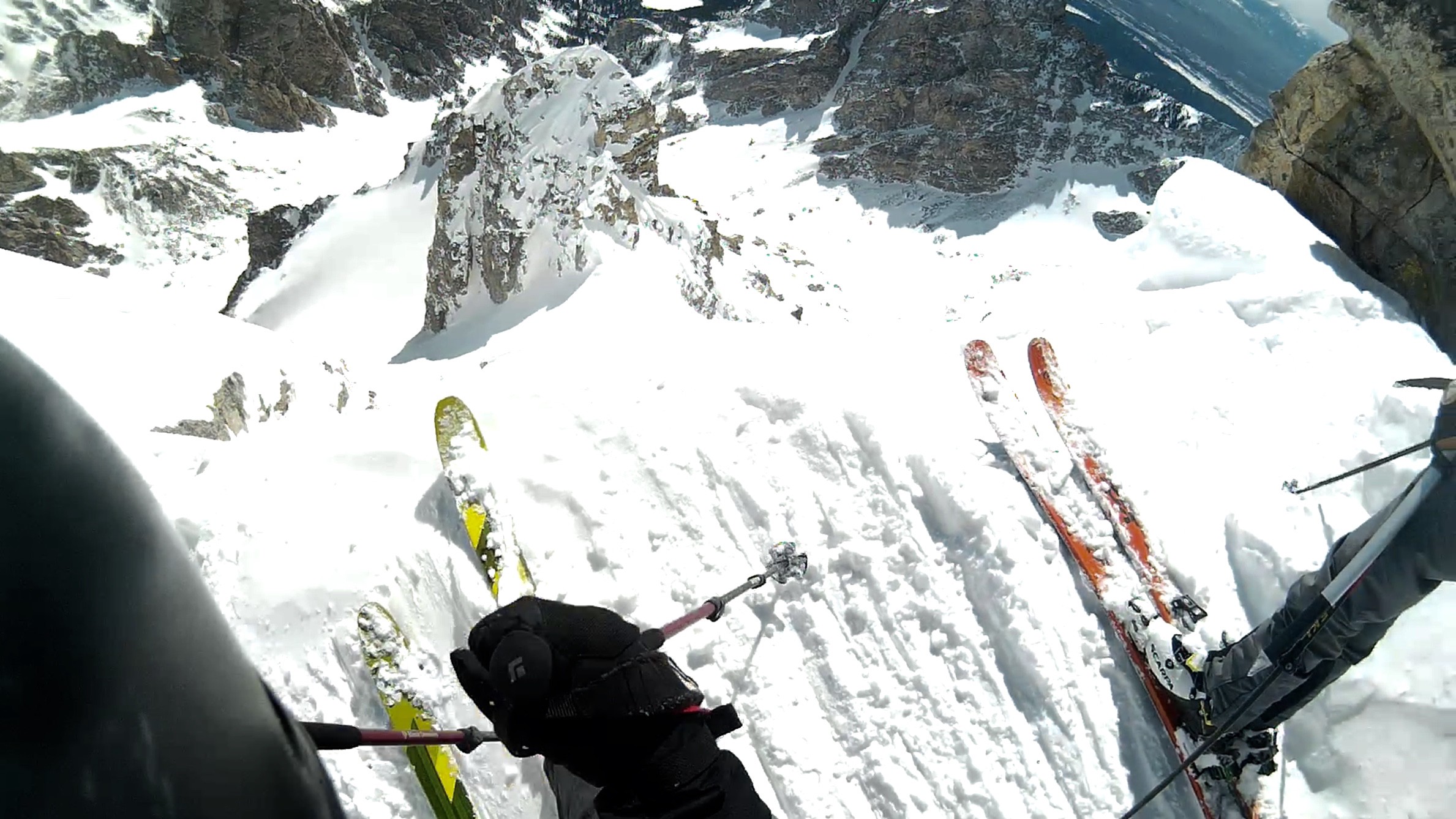 Initially I had planned on retracing my steps, but a combination of wind-hammered snow in the Southwest Couloir and the differing plans of my newfound partners changed my course. Tom and Henry planned to ski the East Face, a high-consequence line terminating at the saddle between the Middle Teton and one of it’s spires, the Dike Pinnacle. From there they would veer north onto the Middle Teton Glacier, and follow the “Glacier Route” into the north fork of Garnet Canyon. With a brand new, never before skied pair of Black Diamond Link 90’s on my feet, my first ever pair of ultra-light mountaineering skis, I wasn’t oozing with confidence. New skis have kinks to break in, just like running shoes and girlfriends. However, the allure of a “50 Classic” was just too much to pass up. After receiving their blessing I piggybacked Tom and Henry’s mission, shimmying onto the wildly exposed upper East Face. Tom and I opted for the popular down-climb to the notch south, traversing knee deep snow above a swath of cliffs. Flirting with fifty degrees, this was no place to fall. Step by step we jammed our crampons and axes into the snow, and after a few heart-pounding minutes we jumped safely into the notch. Henry opted to ski the traverse – a bold decision indeed. Clicking into my skis above the East Face I struggled to suppress the nerves. I was staring down, by far, the biggest line I’d ever skied.