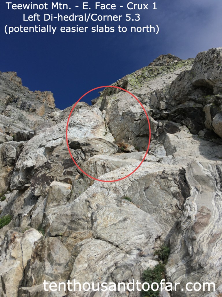 Just above the corner, the second crux becomes obvious and proud. A right facing corner/flake system with three definitive but shallow cracks (shown above, right) provide the unanimously established “best way” to the upper mountain. This “crux” was absolutely not fourth class, and I was absolutely not off route. Though the handholds were positive, a few friction footholds made the movement feel less secure than what I’ve come to expect from Teton fourth class. Hundreds of feet of rolling exposure threatens to fatally devour any slip. The lichen crusted rock doesn’t necessarily inspire confidence. I laybacked gently up large flakes in the steep leftmost corner before stepping onto the central slab and continuing upward with delicate grace. As the gradient eases the hands also become thinner, so the climbing never feels entirely secure until you reach a flat ledge maybe 30-35 feet above. In a storm or wet snow-melt conditions this little pitch could be quite the nightmare. Compared to other low-fifth class routes (such as the Owen-Spalding on the Grand Teton), and to the consensus of many seasoned Teton alpinists, this crux weighs in at healthy 5.4, not to be underestimated. For the alpine novice or Teton inexperienced, a careful size-up of your party should be in order. A mere 30 meters of rope and a few medium-small pieces of protection could be the difference between a fun and dangerous day in the mountains. I have heard reports of a rappel anchor to bypass these cruxes on the descent (potentially on the south side), but didn’t notice any evidence. As such, some cord and a rappel ring could prove handy.