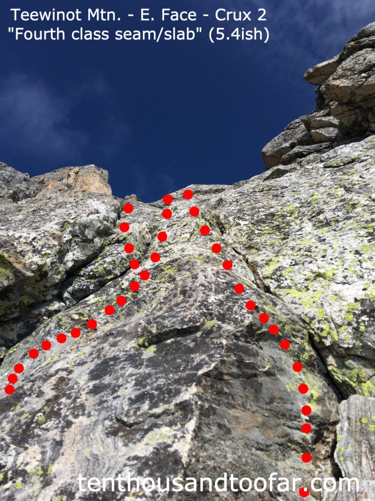 As I began to quest up the infinitely varied and vast East Face, the infamously convoluted nature of the route became ever apparent. Dozens of faint trails zig-zagged every which way, some just petering out, others halting beneath blatant fifth class terrain. Per Aaron Gams’s “Teton Rock Climbs” and general climber consensus, I stuck solely to the north side of the prominent gully (though I did later notice climbers ascending to the south, as Mark Thomas’s picture above suggests). Slowly I meandered along the face, climbing many short sections of fourth class slab and stopping regularly to study my map. Eventually, just as the guidebook warned, the terrain unmistakably changed, both in steepness and difficulty, marking the “crux” section of the route.