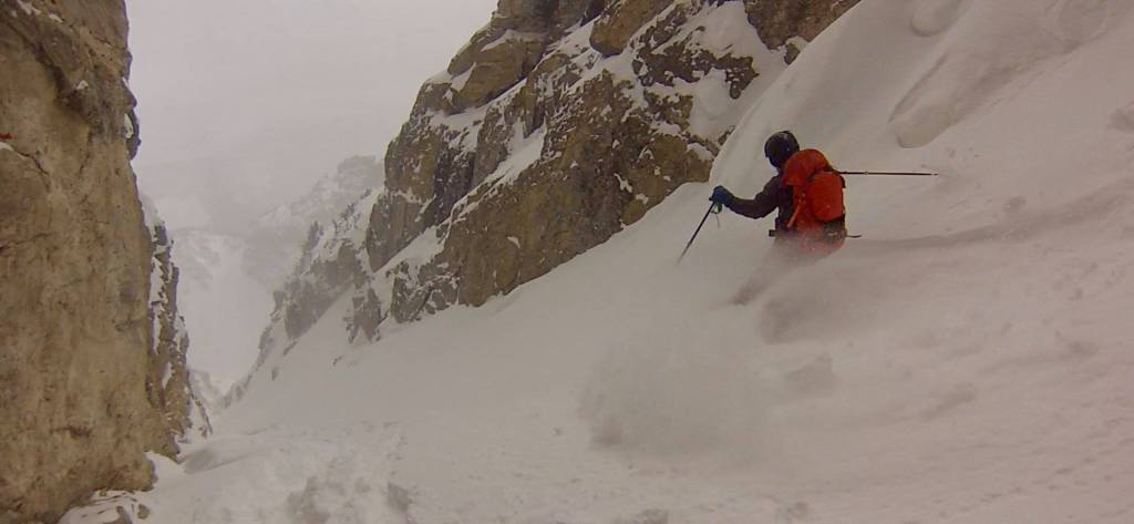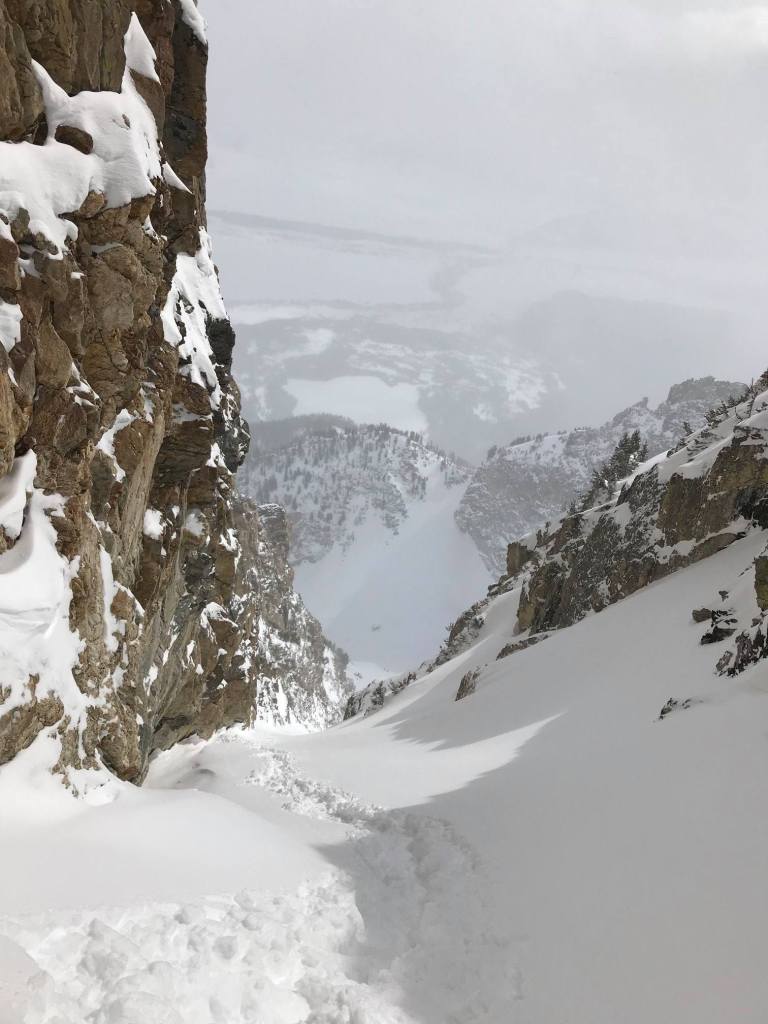 John took lead for the first half, carving knee deep turns and vanishing into explosions of powder every few seconds. He pulled over halfway and called me in. Although I struggled to keep damning thoughts of the entire couloir ripping and flushing me into the basin below, I pointed my tips and snuffed the irrational fear. Some terrifying pockets of thigh deep snow gave way to more reliable knee-deep goods below, and as I swung ambitious turns into the steepening belly my trepidation dissolved into pure stoke. John waved me through for a full pull, but as I skied by my legs grew intensely heavy. A thousand feet of deep powder crushing is no light expense for the quads, dropping my pace to searing jump turns by the bottom. I watched as John trailed my track with a grin wide as the Teton sky.