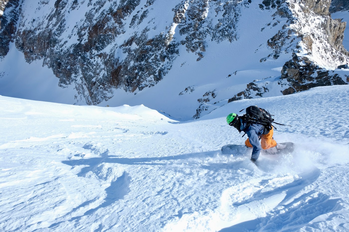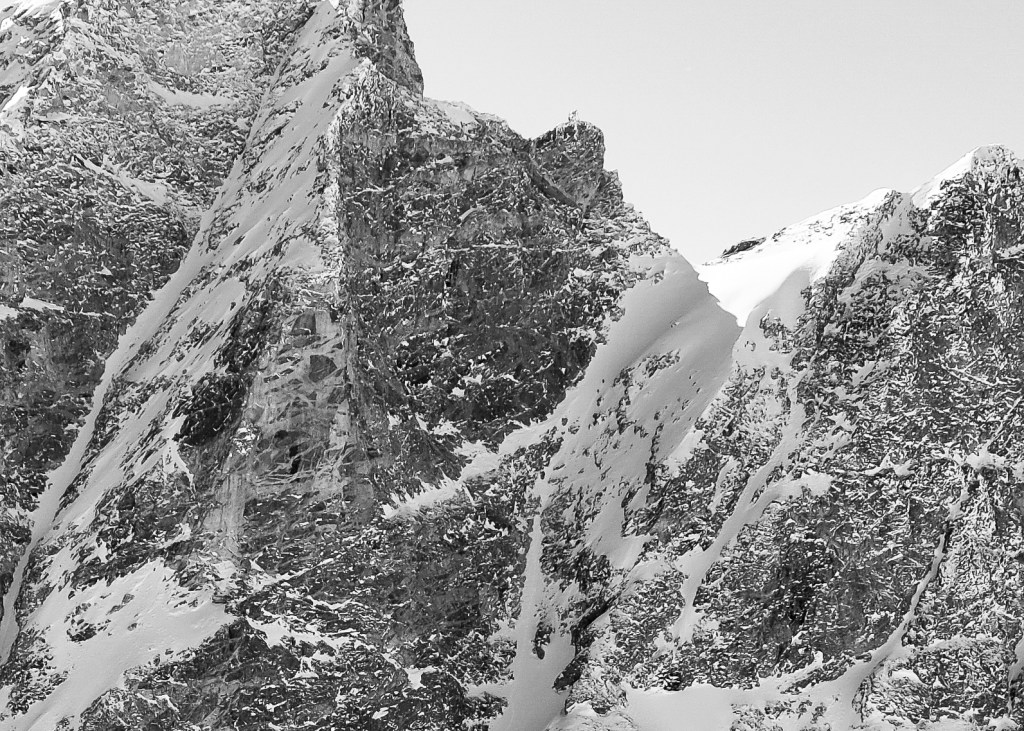 Blame stoke, blame pride, but I opted to ski from the summit. After watching me hack three of the steepest and highest consequence turns off my life, skidding unglamorously between each one, Sam pulled out his ice axe and initiated a down-climb. I couldn’t blame him, the consequences for catching an edge were damning. In corn-snow conditions the upper headwall wouldn’t be so risky, but we were battling sun-crusted, wind-blasted and refrozen sastrugi, about the closest snow comes to water ice – had I not a whippet, I’d have folded my cards.