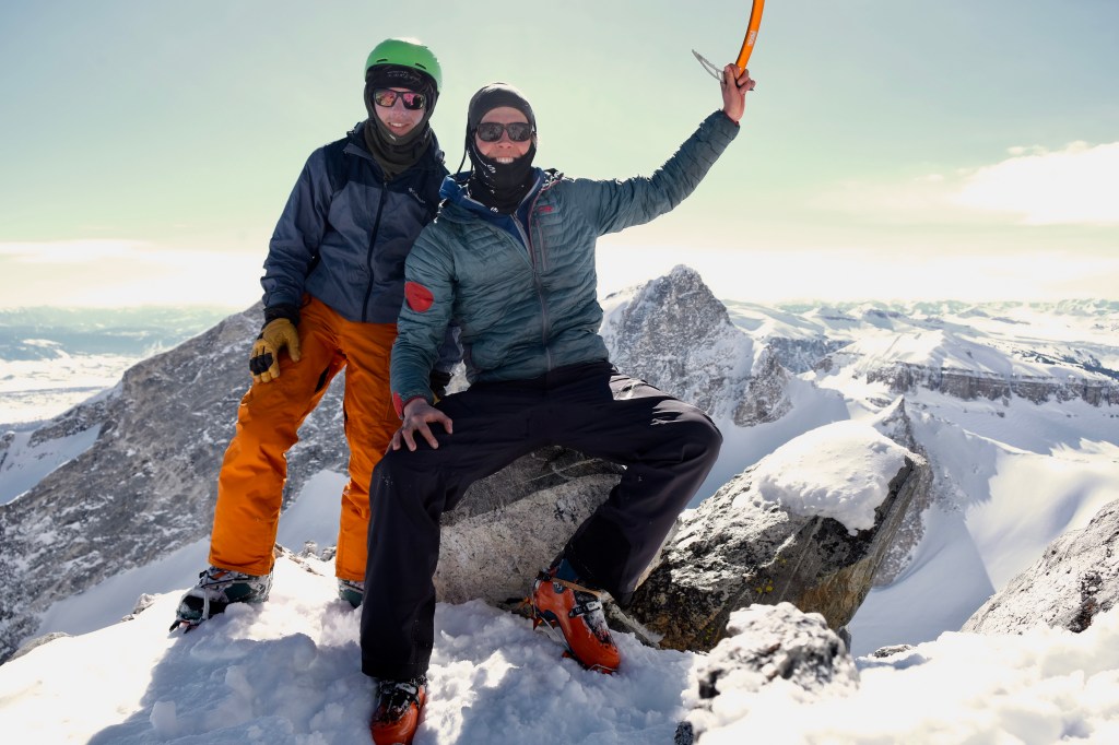 At the convergence we delved left into the South Fork, working our way up multiple steep headwalls and gullies towards the canyon’s terminus. Once I was all but certain we’d gone too far, an obvious south facing gully came into view. The moderately sloped approach couloir forms a direct highway to the prominent saddle, rising about 1,200 feet from the canyon belly. As we climbed through perfectly softened corn we spotted two skiers ascending the Northwest Couloir on Buck Mountain. The line looked burly, making our adventure seem like a side-country jaunt at Jackson Hole Mountain Resort. I enjoyed the cross-canyon spectacle at every available break – the gutsy crew damn near pulled it off – but by the time we topped the saddle they were pulling the plug. Who knows what went wrong, but they conceded a mere fifty feet short of the ridge and never did unsheathe the planks. As we rested and transitioned to crampons for our technical sabbatical, we watched as they down-climbed the upper couloir and the crux – a long walk for no turns, but that’s just how the game of ski mountaineering goes sometimes.