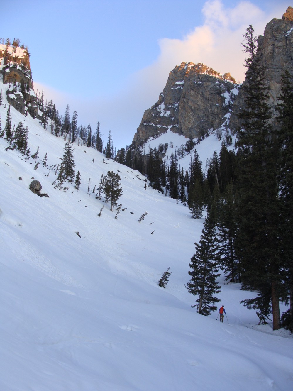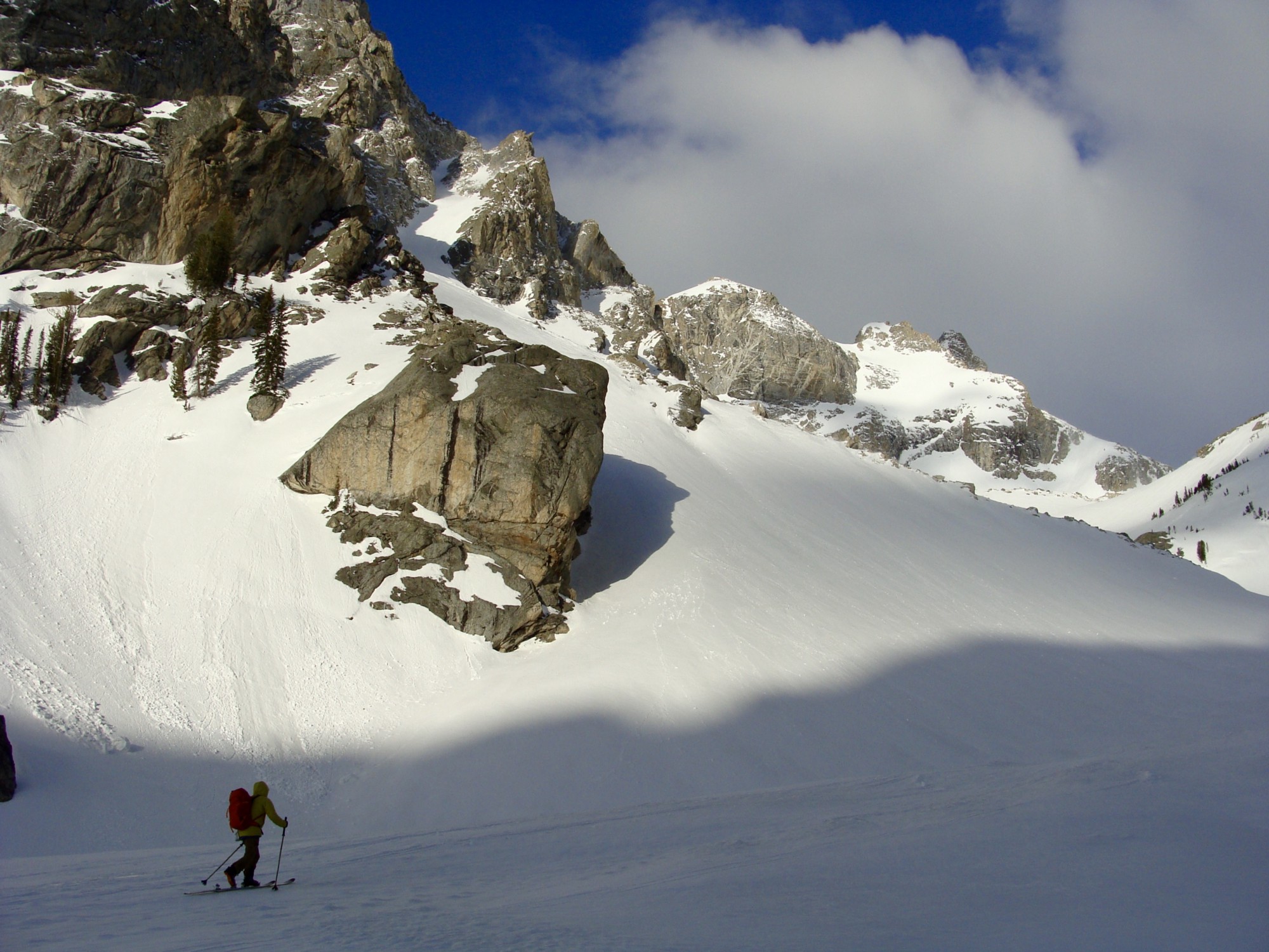 The turns through the couloir were utterly immaculate corn, soft but supportable with three inches of bite. The central gut was stuffed with avalanche debris, so I stuck to the steeper but smooth skier’s right wall – link a few turns, traverse out, repeat. Wet sloughs propagated intermittently, but I managed the hazard by avoiding the fall-line altogether, taking breathers to let larger monsters run their course. About halfway down John initiated the party ski, and together we took full pulls through the Amor A’ Vida, salivating every turn. Many hoots and hollers were had, steep turns enjoyed and high fives exchanged, for we just skied an A-list Teton classic in about the best spring conditions any mountaineer could ask for.