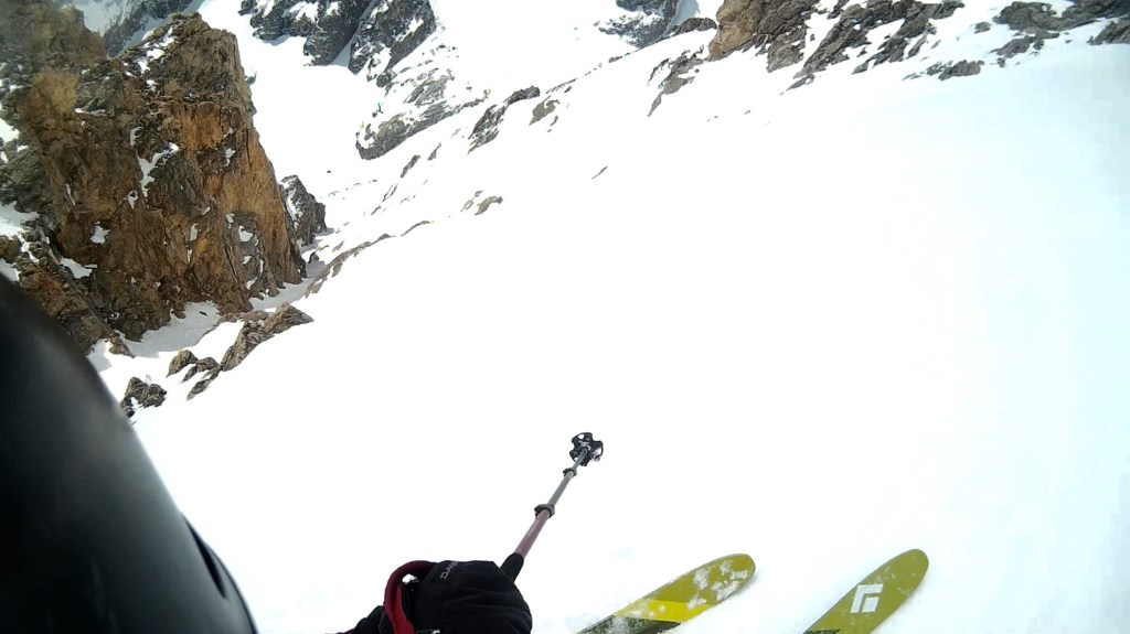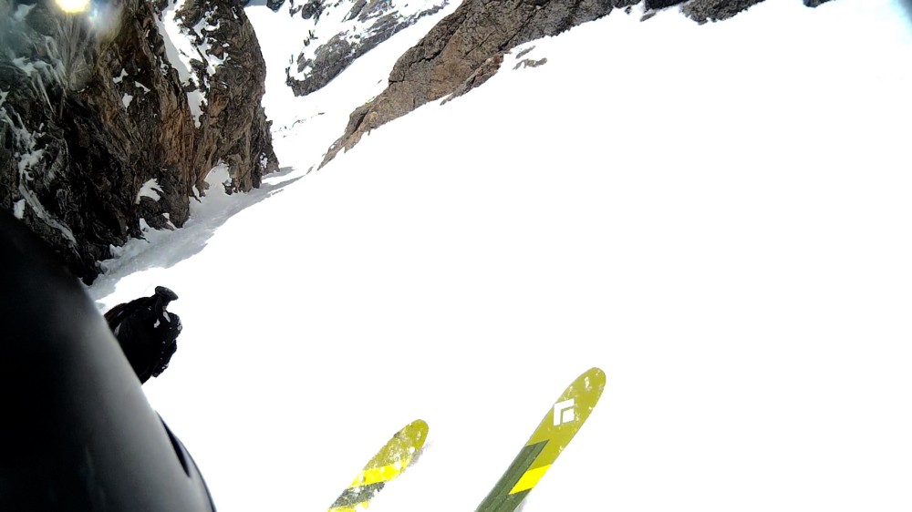 Tragically, the Amor A Vida has been the site of at least two fatalities, in 2011 and 2017 respectively, speaking to the complexity and unforgiving nature of the line. The upper snowfields leading to the couloir are prime avalanche terrain, an unsupported snowfield averaging ~41 degrees with significant solar and wind exposure. The traditional descent involves skiing the Southeast Face to approximately 11,750 feet, where a notch on skier’s right provides access to the couloir. The couloir might be able to be accessed from higher, but definitely not lower. We caught the face in prime conditions, perfect edge-able corn providing pleasantly airy jump turns above the breadth of the southern range. We used an altimeter to confirm the location of the notch, which can be “ski-through” mid-winter, but for us required a brief third class down climb. Below the rock we enjoyed the best of views – 2,000 feet of untouched Amor A’ Vida corn staring back at us.