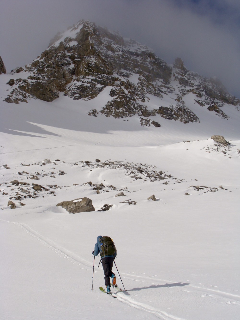 Being as Teton naive as I was, I hadn’t the faintest clue we weren’t ascending the Northwest Couloir, the South Teton’s standard ascent route. With John’s experience I figured he’d virtually guide the way, and guide the way he did – just not as I expected. We ended up climbing an unnamed north facing couloir to the saddle separating the South Teton and Ice Cream Cone, east of the summit. From the col we pivoted west and ascended the East Face, a popular 4th class summer route commonly used to traverse the South Teton/Nez Perce Ridge. However, when chocked with snow we found the East Face a steep, spicy and unreliable field of sparsely covered choss. I trailed John’s wake as we plunged through intermittent solar snow and scrambled a few bands of loose granite. Once again route finding cost us significant time, but once again we got bailed out. Instead of the forecasted bluebird skies, intermittent thin clouds provided just enough cover to keep snow surfaces cold. Even though we summitted after 11:00AM , the snow hadn’t softened an inkling. After many hours of racing Father Time our day finally came to peaceful stillness. We were on top of the South Teton, the fifth tallest peak of the mighty Teton Range, and the best was yet to come.