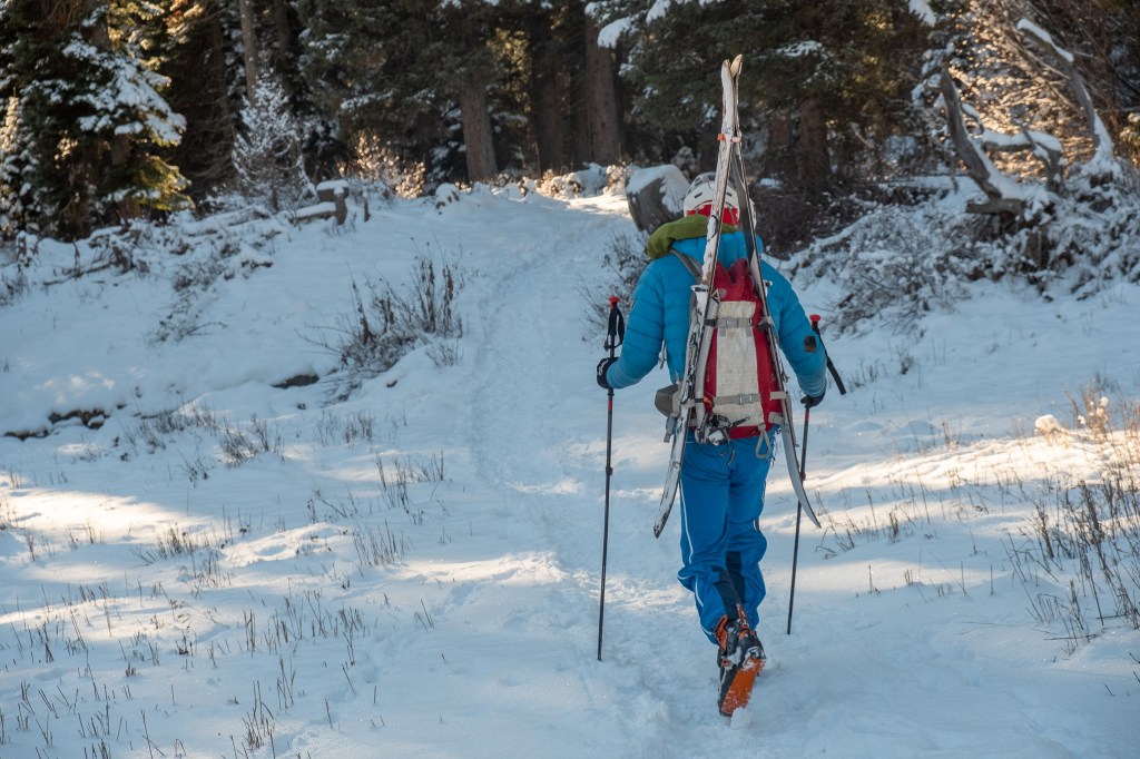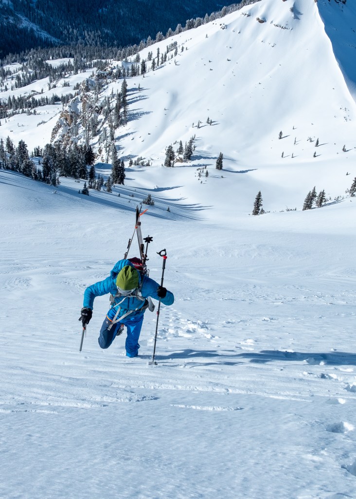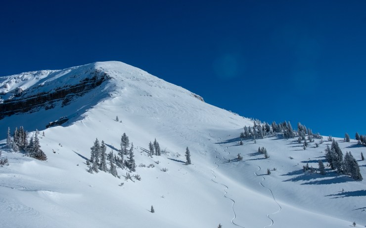 The morning was far colder than we anticipated, with temperatures in the single digits as we climbed into the exposed meadows of Darby Canyon’s North Fork. We had been on skins for over three miles and were just starting to emerge from the dense forest. Luckily we got to start at the summer trail-head which substantially chopped our approach – you never know the hand forest service roads are holding. Six inches down low turned twelve as we climbed past 9,000 feet, becoming deeper with every increasing notch of altitude. For those unfamiliar with ski mountaineering from the Tetons west, approaches are very long and often involve lots of time spent crossing rivers, meandering through shubbery and other lowland foolery. For this reason, peaks of the west are skied exponentially less than those of Grand Teton National Park. However, for motivated folk who don’t mind a little extra effort, the west side provides phenomenal skiing on reliably untracked slopes.