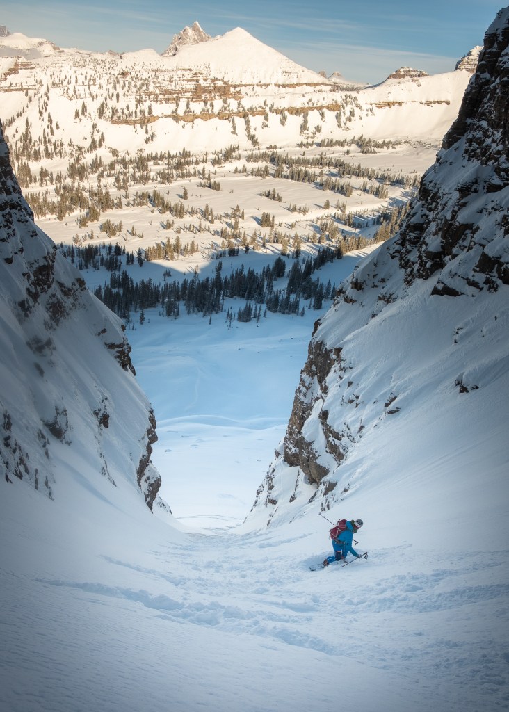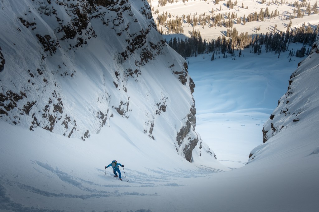 As soon as I clicked into skis my aloof vision hyper-focused. My slope meter read just over fifty degrees, and this snow was deep! Carl had stopped before the angle kicked up, and bunkered beneath a rock as I hacked my first turns. Honestly, I’m not sure I’d ever skied fifty-plus degree snow in such deep conditions. Slough rained down steadily but was easily managed, and I returned to Carl with surprising ease. Despite being hardly above 10,000 feet, this couloir had a sort-of “epic” feel. Directly across the way stood Mount Bannon, The Grand Teton and Mount Moran’s striking Southwest Couloir. Terraced limestone walls towered hundreds of feet on either side, and our channel wasn’t much more than twenty feet wide. For a photographer, all the elements were there, and as Carl took first dibs in the belly I had a ball scoring some picturesque shots. I followed with only hoots and hollers for the second run in a row, taking a full pull through the couloir and blasting onto the apron with ever widening turns across a virgin snowscape. The run-out was just long enough for my mind to wander and develop conscious thoughts of gratitude – how blessed we are to live, learn and play in such a beautiful and wild place!