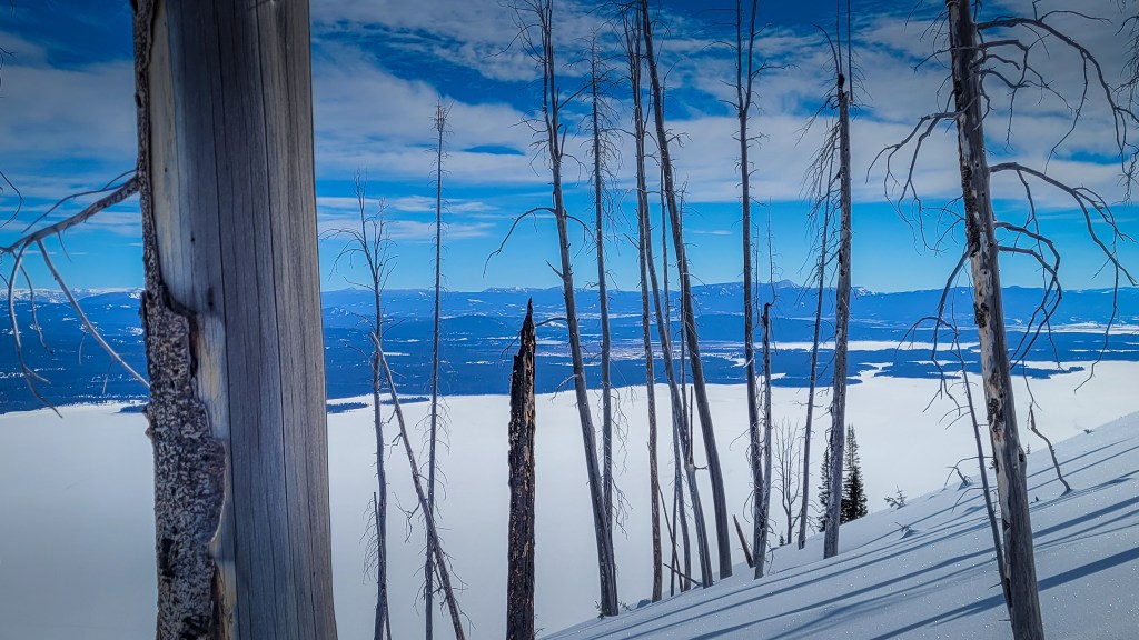 When the thicket parted ways and the clock struck hour three, we found ourselves below a marvelous and gentle powder field leading up Leeks’s easterly flanks. Many ribs separated moderate and lightly treed avalanche paths with potential for amazing fall line powder skiing, much like the ever popular Mavericks and 25 Short to the south, but more open and continuous. Matt and I swung leads, punching a track through a generous foot of sugar, about 1,600 vertical feet to the ridge-top. Having expected dust on crust I was overjoyed at the idea of skiing quality snow, and given the lack of storms over the last month, I frankly couldn’t believe my eyes. At about 8,200 feet the terrain flattened to a long ridge-walk through an old burn, a picturesque scene that yearned for my Fuji XT-2 camera still holed up in the shop. I shot as best I could on my smartphone – she’ll be home soon.