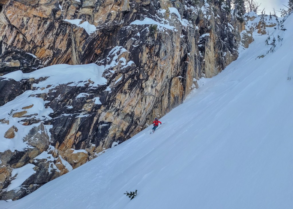 Considering the weather of late, our skiing was all-time. The 45 degree, 700 vertical foot upper couloir gifted slough chasing turns in a dramatic setting. The belly was a mixed bag with intermittent crust, but dished mostly ripper turns on it’s north tilted bank. The down-climb through the “5.2 trees” and subsequent ice was the ultimate crux, but proved more passive than expected. Further great lowland powder and a few spicy pillows off Inspiration Point were the cherry atop our very sweet Symmetry sundae. Were the run 1,000 feet longer, or were there not an exposed mid-route waterfall, I’d be willing to deem the Symmetry Couloir a Teton classic. I look forward to re-visiting this area and exploring the nearby Hanging Canyon in years to come, as several unique couloirs dive both north and south off Symmetry Spire’s eloping east ridge. The return slog on the GTNP groomed nordic track was downright painful, exacerbated by skate skiers whizzing by at ward-speed, but at least we saw that part coming. Ten-some roundtrip hours we reached the car, tired, hungry and ready for snowflakes to return, though turns like these make the wait for Old Man Winter ever slightly more bearable.