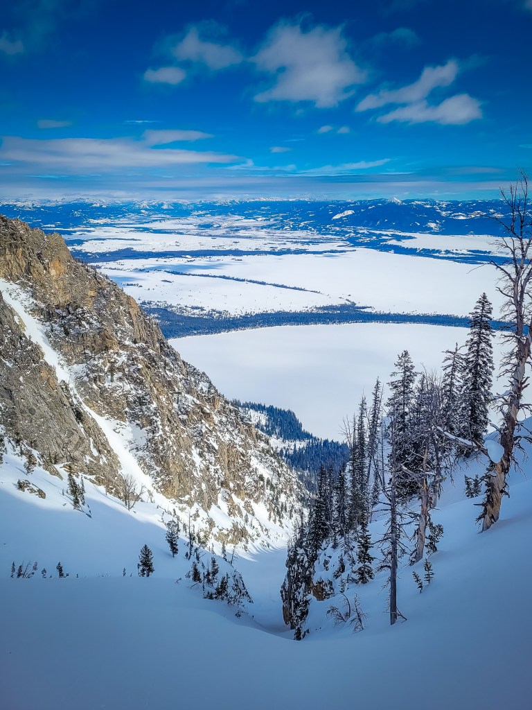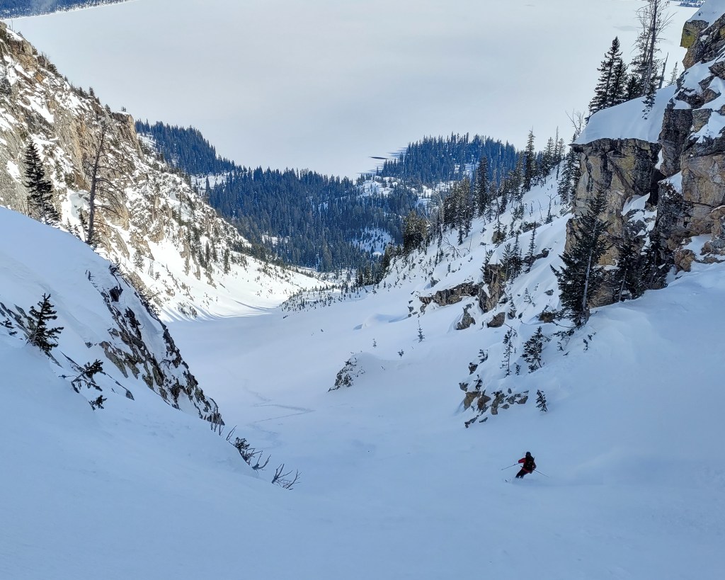The Symmetry Couloir is the large avalanche path directly south of Symmetry Spire, north of Storm Point, on the opposite shore of Jenny Lake. On February 6th, after almost a month of minimal to no snow, Chase Krumholz and I set off for this obscure line in hopes of harvesting untracked turns.
