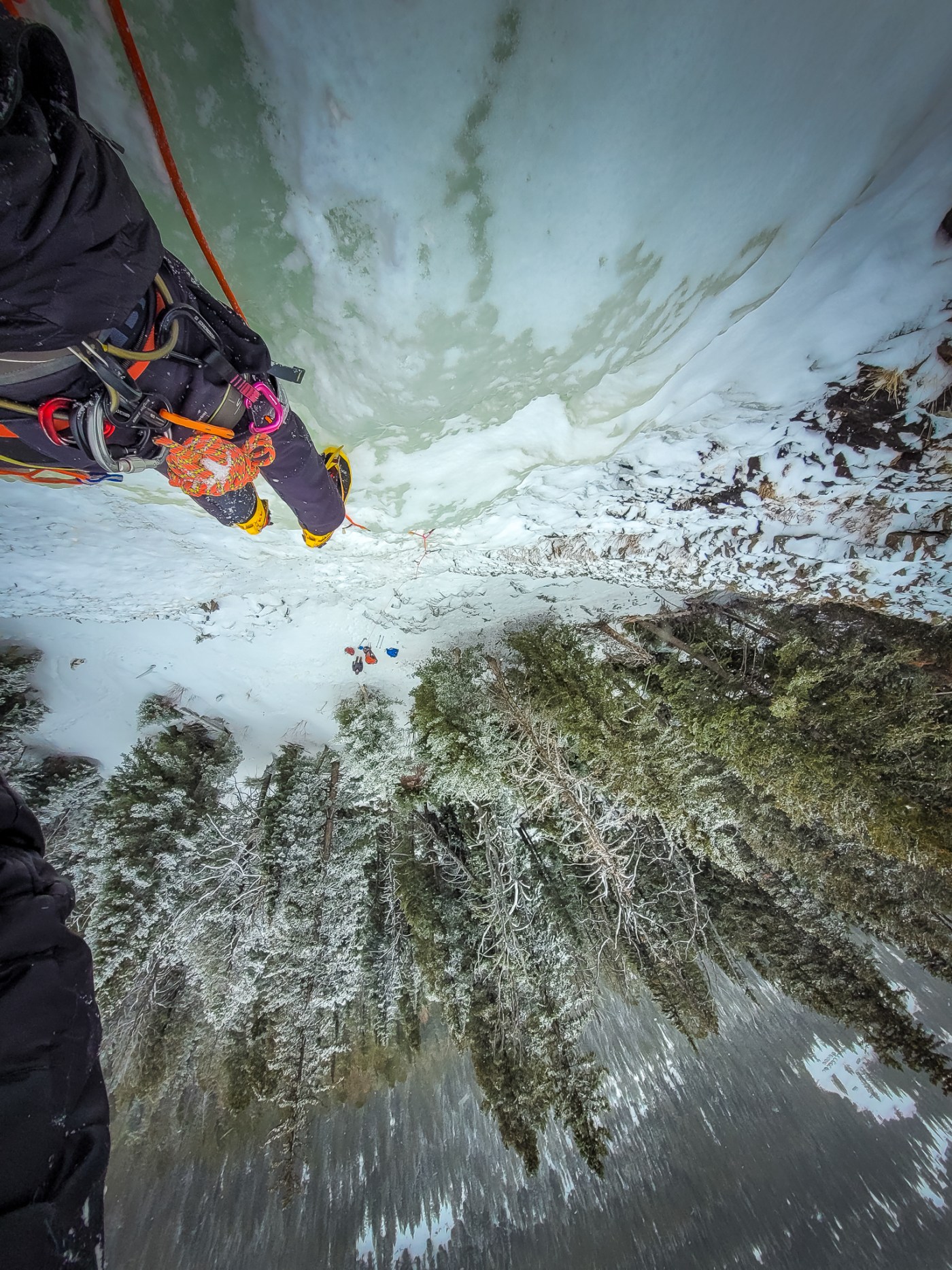 The Fat One was supposed to be my warm-up, but quickly turned into the main event of the day. Instead of taking the easier lines on either side of the flow, I harnessed Brian’s energy and went for the steepest and least traveled line. Though probably only 30-35 feet, the center of The Fat One’s lower curtain is definitive WI-4 and still clean as a whistle. After two sketchy screws I began to feel the wrath of terminal pump in my forearms. The bomber hooks from G1 weren’t here to save the day. My picks started to deflect with fatigue, and my heart tingled with fear. Brian said I learned a valuable lesson familiar to ambitious ice climbers – how to problem solve when things turn dangerously sour. My first instinct was to punch it up the final ten feet like a rabid coyote, but Brian’s advice to “slow down” brought me back into the moment. The two screws between me and the ground weren’t worth two cents. I switched grips and stances incessantly until finding rest barely decent enough to sink a god-sent bomber screw, get two good sticks and yank the crux bulge. On the rolling ramps above I needed a five minute rest to de-pump the phantom lacrosse balls in my forearms. Thankfully, the latter half of The Fat One is a straightforward WI-2 romp. Crude lesson learned: ice grades are not like rock grades – all WI-4’s are not created equal.