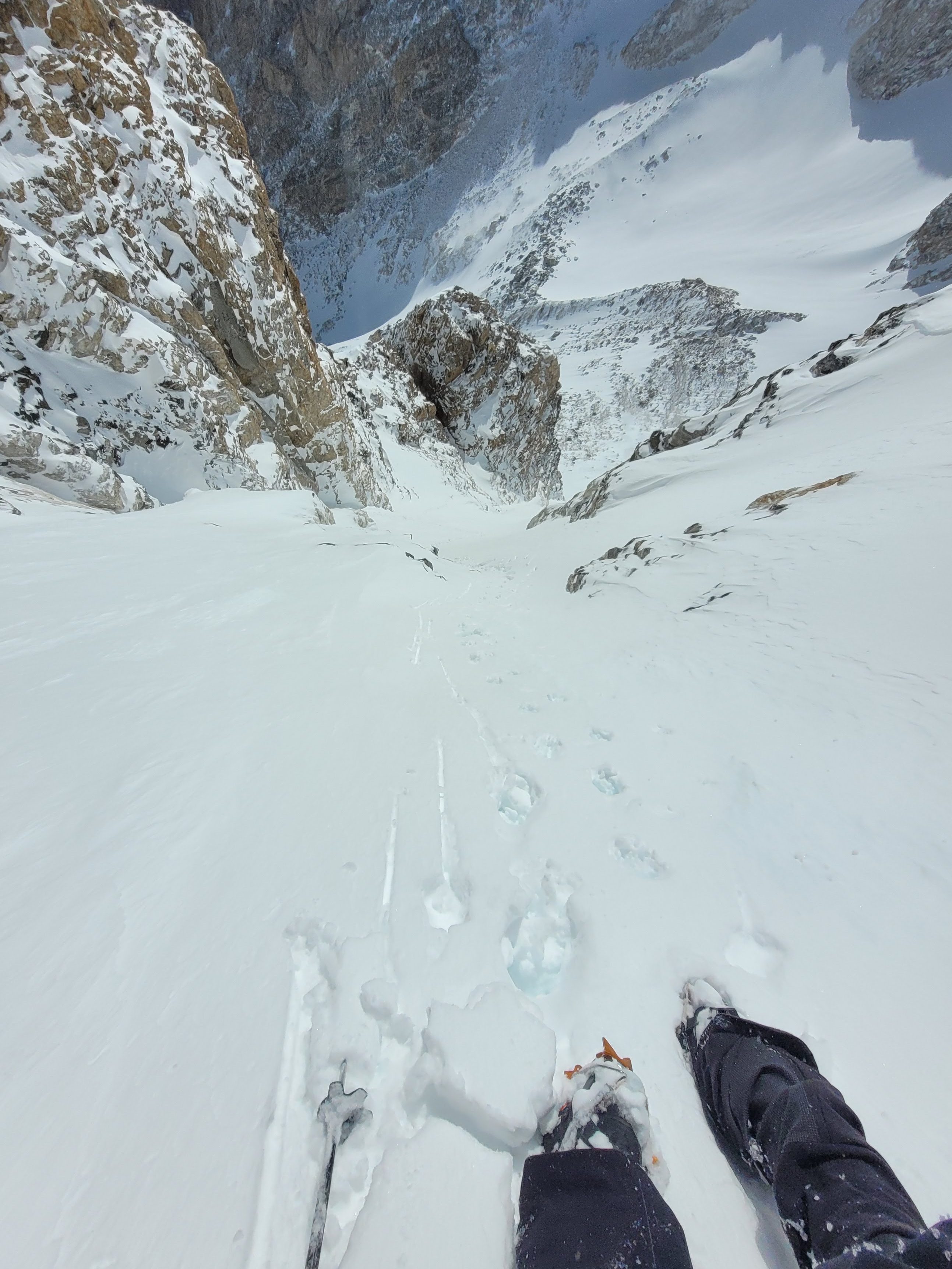 Much to my surprise, both the Ellingwood and Chouinard Couloirs were filled in, with the former looking ever so slightly more approachable. Both had substantial whale tails, slough piles and wind mank on their lower flanks. The Chouinard seemed mostly good, but a few snow undulations birthed fear of wind slabs. The Ellingwood on the other hand looked mostly uniform, fit for a great alpine climb at bare minimum. One of the nicest parts about the Ellingwood is the opportunity bail onto the north facing Middle Teton Glacier, which begins at the same skier summit, if faced with unfavorable ski conditions. The Glacier Route is still steep and technical but not quite Ellingwood level, providing an almost always easier and shaded descent fit for anyone with the skills required to consider skiing the Ellingwood in the first place.