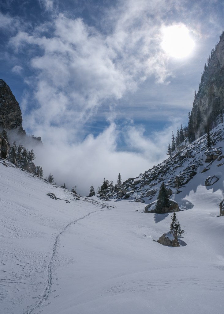After snapping a few pictures at the base of the Ellingwood I made moves for Bradley Lake, traversing the north wall of the canyon to the Cave Couloir, milking another 1,000 feet of silky pow and eventually relenting to the reliably heinous Garnet Canyon out track. Maybe I’m just a baby, but I hate isothermal moguls. Breaking trail from start to finish, my Ellingwood couloir mission logged nearly 6,000 feet of vertical and culminated around seven hours. Depending on the party and snow conditions I could see anywhere from six to ten hours being a comfortable round trip time. I was definitely incentivized to push the tempo given an unexpectedly under-filtered sun. Steel pointed mountaineering crampons and a light duty ice axe, as well as ski crampons, will be in my pack for my next trip up the Ellingwood. All in all, skiing this line encompassed virtually everything I love about Teton ski mountaineering. Aesthetic, steep, exposed, engaging climbing, relatively easy access and the added bonus of fresh stable powder? Correct me if I’m wrong, but it doesn’t get much better than that.
