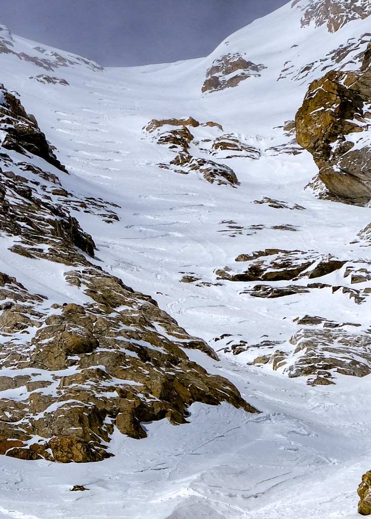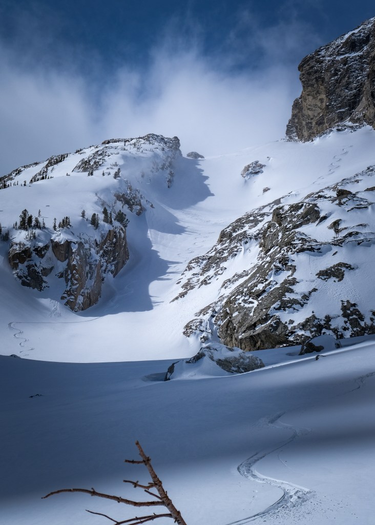After a handful of slow turns to quell my nerves and calibrate the ski mountaineer senses, I settled into the best run I’ve ever had on a pair of skis. With the exception of a few grabby turns off the very top, the snow in the Ellingwood was light and bottomless but perfectly supportable, with no signs of instability. My biggest concern was slough management, prompting diligent terrain awareness. Even through the crux cliff sections I found the courage to ski confidently, jump turning through tight rock bands as if they weren’t there. In 55 degree terrain one isn’t skiing as much as they are “controlled falling”. With each turn I would throw myself down the slope, catch legitimate hang time, rotate 180 queued in to relishing every moment. At the lowermost and tightest constriction I intentionally ski-cut one small wind pocket and side slipped over the following water ice before enjoying a few hundred feet of lower angle turns into Garnet Canyon below. When I stopped at the base of the line to admire my tracks, the first thing I noticed was the utter silence. The wind had completely keeled off. I reckon I could’ve heard a pin drop. I stood stunned beyond belief, in a daze state, as if I’d woken from a dream. Staring up at my tracks winding through the couloir I felt consciously out of my body, in a transcendental, lucid dreaming sort of space. If I find a way to encapsulate the feeling I had at the base of the Ellingwood Couloir within the confines of written human language I will report back, but for now let’s just say I was really, really happy, and the skiing was very, very, very good.