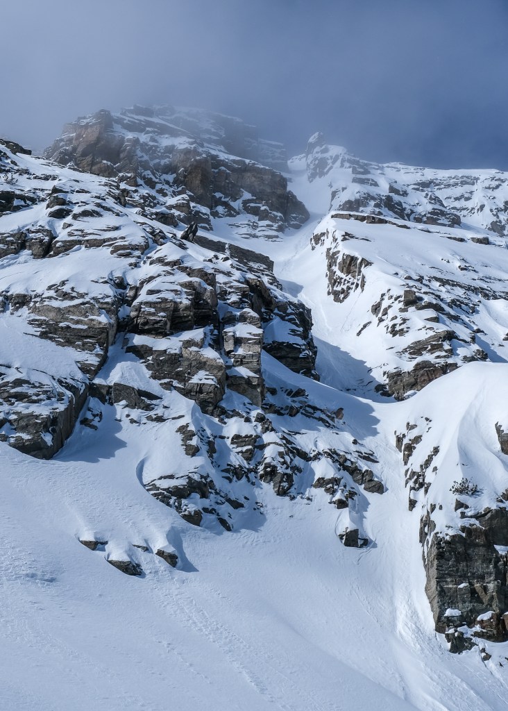 First sights of the massive glacier were remarkable. The hunk looked like like a big brother of Teton Glacier on steroids, seemingly twice the size with a similar eloping nature. Low clouds burned off the higher we climbed, revealing a stunning and daring east face of Eagles Rest Peak. I could hardly hold back the impulse to climb an absolutely breathtaking northeast couloir, bisecting the face south-to-north in a brilliantly exposed, true Teton ski-mountaineering kind of way. Another nifty east facing couloir dove directly off the summit block, with approximately 500 feet of dead-end couloir skiing leading to a wildly exposed southerly traverse exit. Whew, I cannot wait until I make it back to this zone of inspiration. The east summit of Eagles Rest’s western face, on the other hand, looked like something Dave MacLeod might try to climb in a devilish dream. I’ll pass!