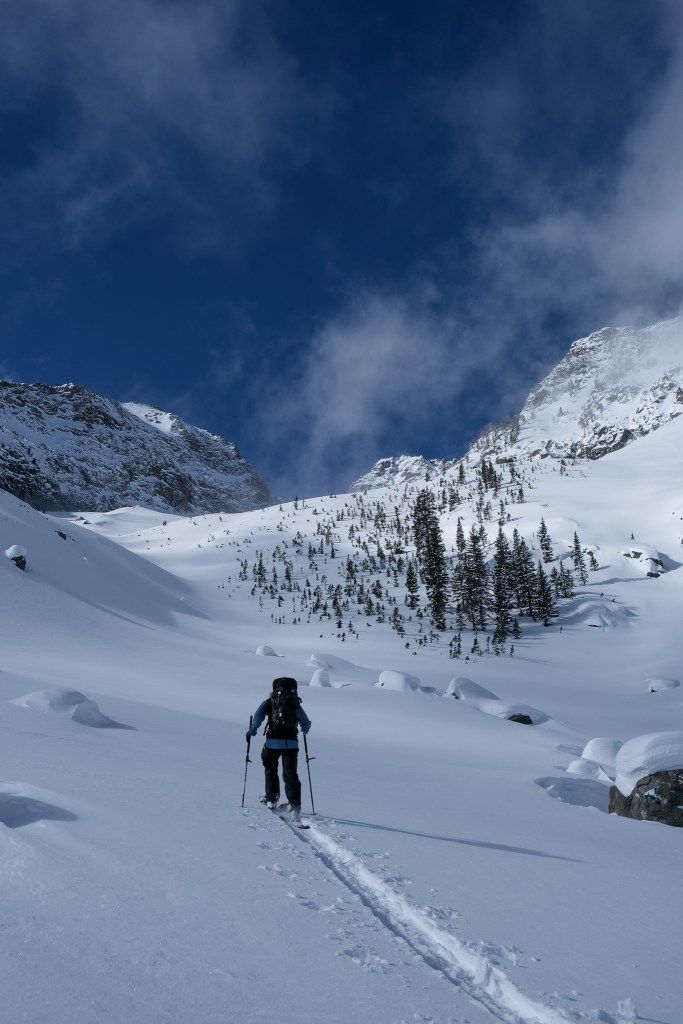 Once in Waterfalls Canyon, the optimal approach seems to contour along the south side of the drainage, generally staying a few hundred feet above the river. After approximately 1.5 linear miles, dense trees relent to an open basin with views of Eagles Rest Peak to the southwest, Peak 10,686 to the direct north and the stunning Columbine Falls (WI4?) straight ahead.