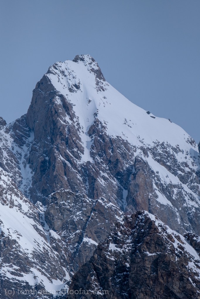 At the base of the Banana a savage spring sun came out full force, reminding us of the three hours wasted retrieving my backpack, that wet avalanches were a real problem and time was of the essence. Luckily, once one finds the right approach gully, climbing the Banana is a simple game of plug and chug. We spent the first 2,300 feet of our ascent in ski crampons, crunching up the barely frozen melt-freeze crust, oscillating between the gully belly and the ridge on climber’s right. The lower elevations were already corning as we passed by. The race was officially on.