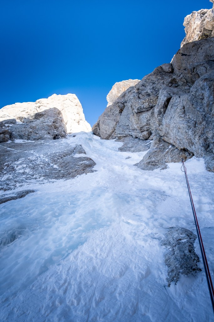 I set out ahead of the second party, and overlapped the guide crew at the base of the Stettner Couloir around 5:30AM – hour four. They were racking gear and flaking ropes for a protected climb, and were very friendly when I asked to solo past. The ice in the Stettner was exactly as it was in January, a few easy patches of WI2, none exceeding 20 feet, with long snow ramps in between. This was my first time climbing ice by headlamp, but on such familiar terrain the vibe was mellow, exactly how I wanted. I reached ‘team overnight’ in the Chevy Couloir, with the leader climbing through the notorious, barely vertical but still mean looking crux bulge. As he moved into easier terrain I soloed by, climbing over their rope and proceeding through the ice without interruption. The team head, another EXUM Guide, was once again very friendly as I climbed by, thanking me for waiting as they negotiated the most difficult part of the route. I shot some pictures of the guide and his client as they climbed into the Ford Couloir, and the three of us enjoyed brief rest and nourishment at the nice and flat Petzoldt Col rappel station. Of the two dozen some-odd people I’ve seen on the Grand in winter, these were the first without skis – savages!