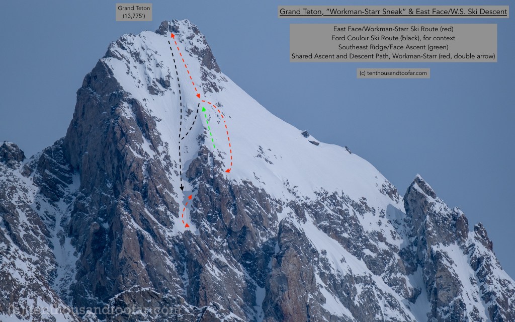 On March 30th, 2022 I completed my first solo climb and ski descent of the Grand Teton, with ropes used for rappel. I used the traditional Stettner & Chevy Couloirs (WI2+, steep snow) for ascent, but climbed a new (to me) variation of the Ford Couloir – the “Workman-Starr Sneak” – to access the summit via the Southeast Ridge & Face. Seeking a first personal descent, I reversed the “Workman-Starr” via the GT’s hanging East Face, some of the most exposed turns of my life. Sadly, a thin breakable crust kept conditions sporty, and the “sneak” was virtually un-skiable, but waiting for corn isn’t always an option when there’s a dozen skiers waiting to rain debris on you from above.