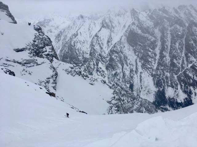 Per the article title, we needed three strikes to find the Tallboy, and both dos and tres happened today. Our greatest error was not bringing a picture of the line, as topographic maps in this kind of jagged, tight, convoluted terrain are of limited use. Following our best instinct I dropped into a large bowl that seemed to funnel into a possible couloir, jump turning cautiously towards the edge of the sightline. As I reached the rollover and the snow became slabbier, I skeptically craned my neck out over several hundred feet of cliffs and shuddered. I was most certainly not in the Tallboy – I had just skied to the edge of the universe. Stranded on the dead man’s face to the west, I reported back to Carl several hundred feet above, switched to boots, unsheathed my axe and booted back to the summit ridge-line securely. Woah.