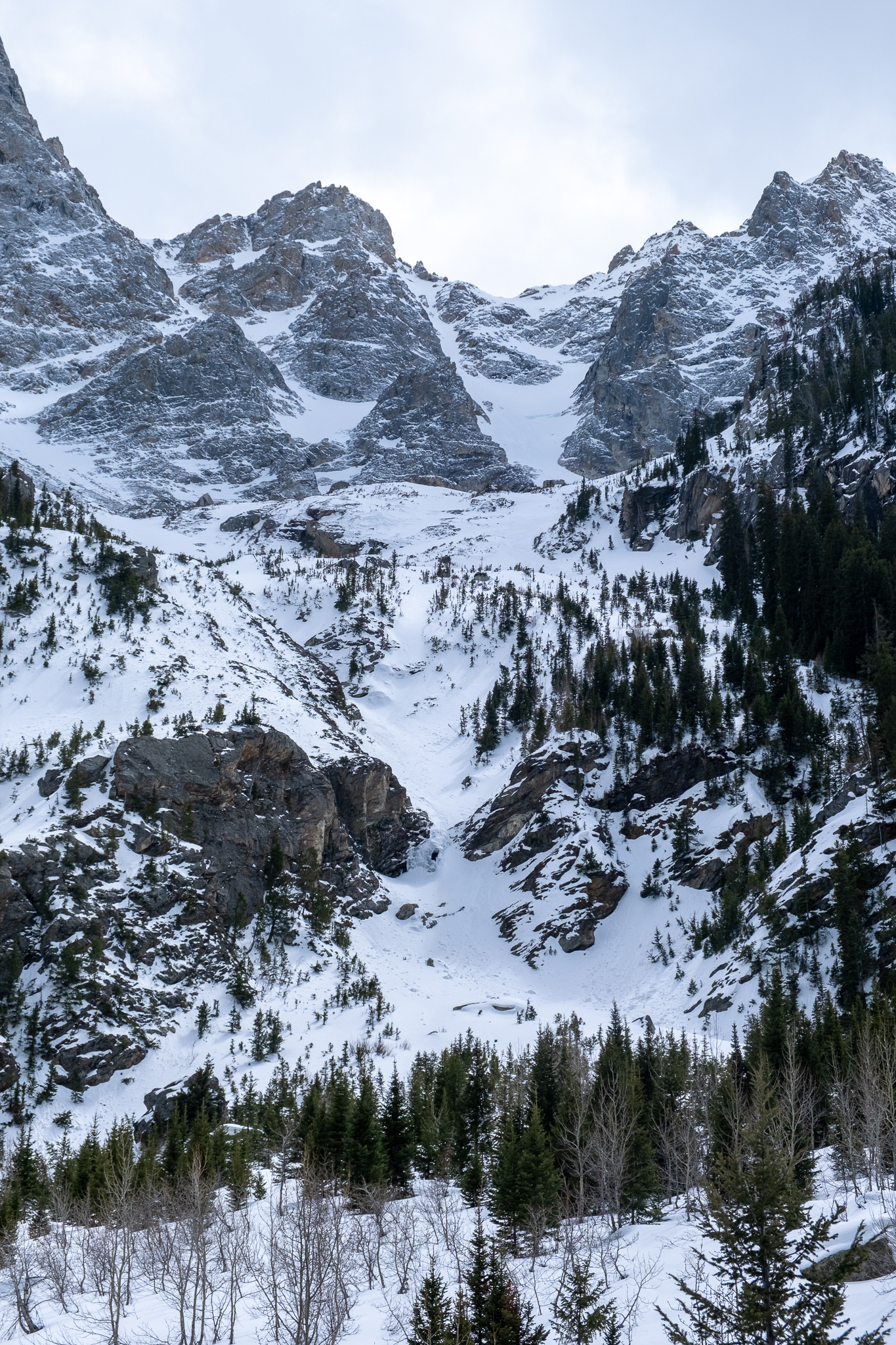 We started on bikes at 6:00AM, switched to skis at Lupine Meadows and made good time into Glacial Gulch by way of the Garnet Canyon summer trail, reaching the top of Teton Glacier by 9:30. A solid melt-freeze crust allowed very efficient travel. Cloudy skies lingered all day, preventing any and all warming concern. Instead of booting Teewinot’s Southwest Couloir to the top of Peak 11,840 – the mistake we made two weeks prior – we climbed the broad southeast facing ramp to the col separating the East Prong and 11,840. By the top of the col we were breaking trail through knee deep snow, absent of slabs or wind effect. Despite light flurries I reckon we could have lit a candle on the saddle – a still morning, about as beautiful as they come.