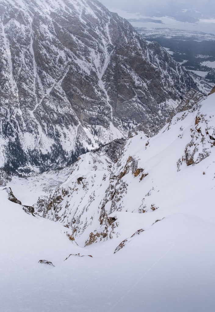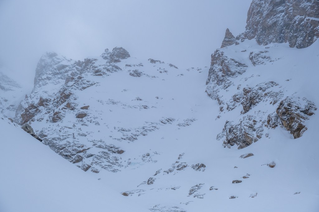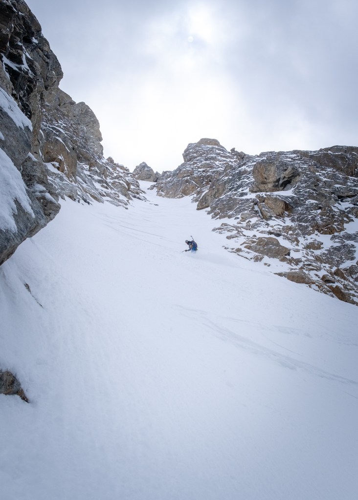 The Tallboy Couloir is the real deal, a 4,000 foot ski mountaineering descent not to be taken lightly. If anything, I think we slightly underestimated just how serious the Tallboy was. Compared to the Evil Twin, which definitely registered as exposed and steep in my book, the Tallboy upped the ante. To fall above the choke would be… well… inexcusable. If visiting the Tallboy in anything other than bombproof conditions, I would heavily consider a thin rope for ski belay. The north facing upper funnel is a prime candidate for deadly wind slabbage, and rocky flanks in the runout below are likely to pulverize any falling debris, human or otherwise. That said, in confident conditions the Tallboy is a truly classic Teton couloir ski descent, aesthetic, engaging and sustained, all in an immaculate setting. An ice axe and crampons should be considered mandatory, as well as a nifty high-quality picture (such as one found on this blog 😎). It goes without saying that skiing onto the dead man’s face is not recommended 😉