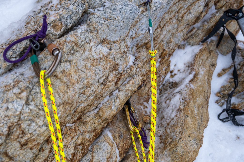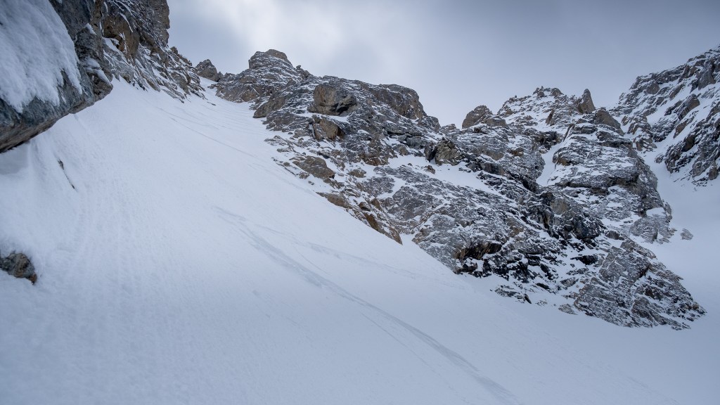 After finally locking into the Tallboy, we needed a plan to dispatch possible slabs in the upper couloir, standing at 50-55 degrees and loaded with at least one foot of snow. While Carl scrambled over the ridge I slugged two pitons into a crumbly boulder beneath a wind sheltered alcove, supplemented by a questionable nut, establishing an anchor worthy of ski belay. This season I’ve been traveling with the “just in case rope” and fixed gear quite a bit, and have been rewarded time over time. Had we not the rope, I’m not sure I would have had the gusto to risk my neck for such an exposed, steep and freshly loaded descent. I ski cut the upper funnel and made the first half dozen jump turns into the gut while Carl belayed directly from the anchor above. After deeming the snow stable I fired some pictures, unclipped from the rando-line and buckled down for some seriously heart pumping turns. (As of February 2023 the cord and nut have been removed, but the pins remain)