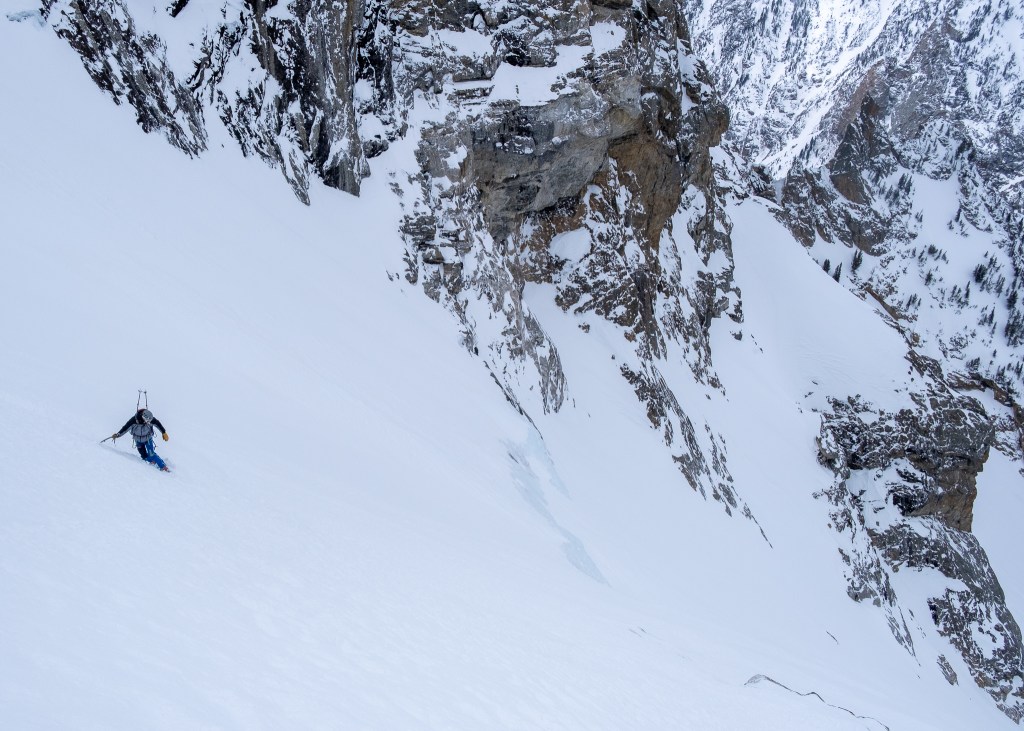 The upper funnel of the Tallboy hovers around 48 degrees, rolling over to a sustained 50-55 degree crux with intense exposure to narrow walls and rock below. The “no fall zone” designation is used too liberally in the ski mountaineering world, but the Tallboy absolutely earns it’s “ski or yikes” badge. As a man who values his life I’ve been known to sideslip such terrain, but the supportive powder provided the perfect interface for confident jump turns through the whole enchilada. Jump, twist, stick. Jump, twist, stick. Jump, twist, stick. The movement was rhythmic but intense, controlled but wild. After the choke a mere 1,000 feet of deep powder couloir skiing remained, far wider, less consequential and ready for the turns of my season. I’m not sure I’ve ever skied so aggressively in 50 degree terrain, and was happy to rip the full Tallboy in a single push, not that there are many safe zones anyways.
