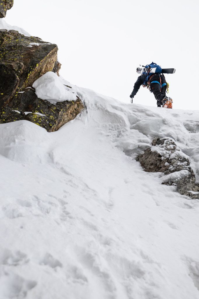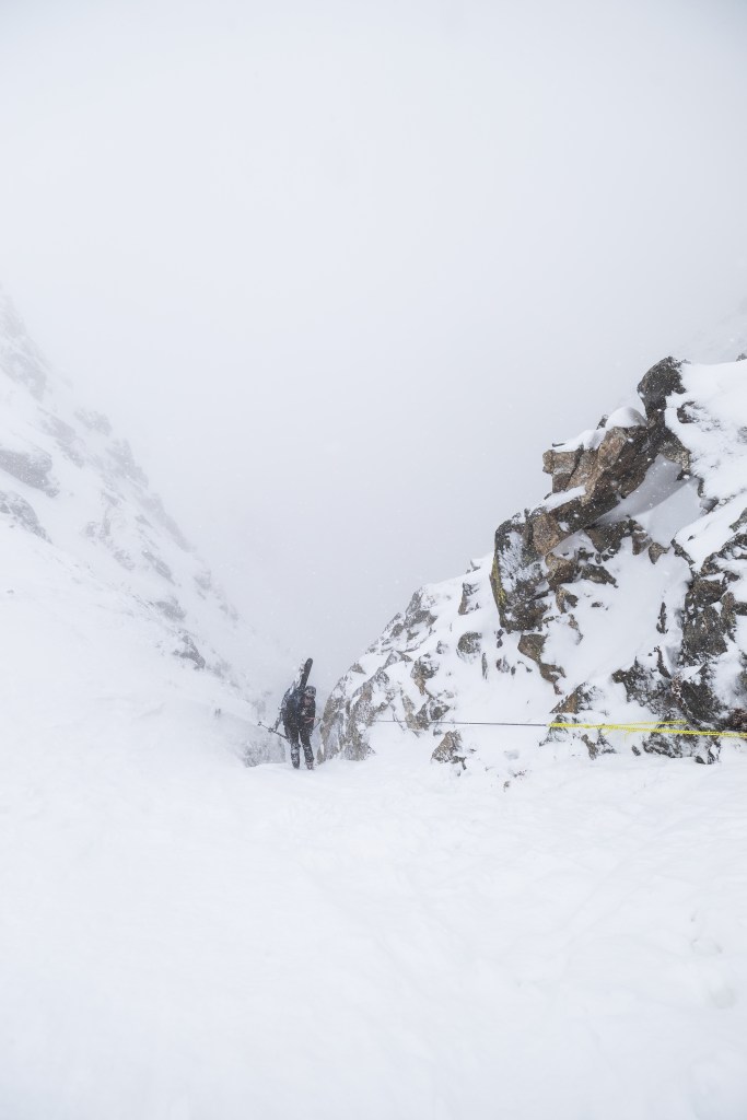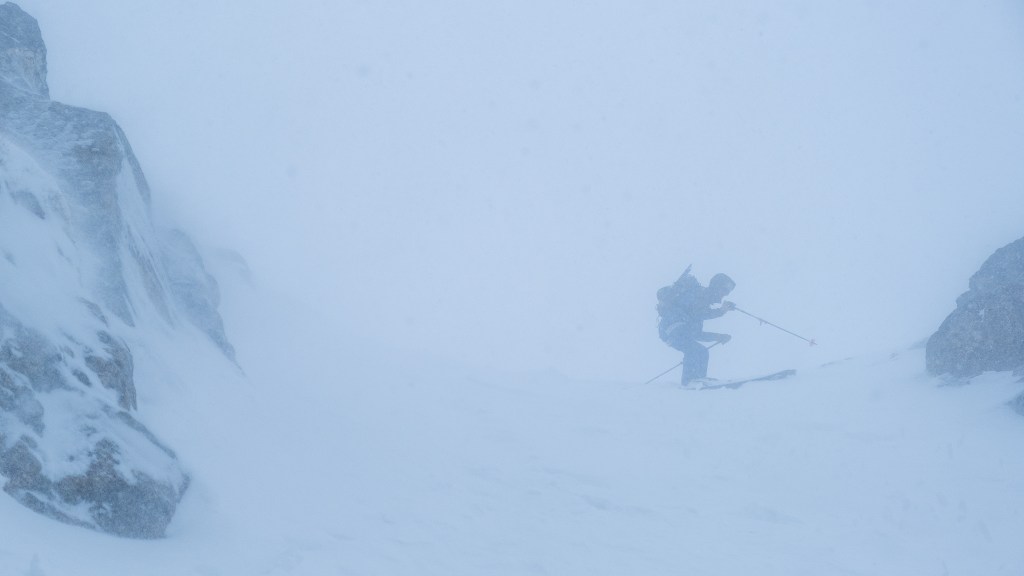 The weather flip from bluebird skies to apocalyptic whiteout was both appreciated and detested. Combined with warm temps, the unfiltered sun was releasing substantial debris from the western wall above the couloir, and threatened to weaken wind slabs in the upper bowl. The apocalyptic snowy whiteout mitigated those problems but reduced visibility to a measly few body lengths – quite the tradeoff. The only way we managed a safe descent was by skiing within immediate view of our boot-pack. Fortunately, the first two dozen turns from the summit to the crux were magically light, secure and trancelike, some of this season’s best. 50 feet above the anchor the slope spills over in excess of 50 degrees, and with mega exposure was no place for misstep. Originally I figured I would down-climb the final bought to the anchor, but a supportive crust seduced me into a few more blood pumping jump turns, one of which point-released a bathroom sized windslab over the icefall with intimidating force – time to tread lightly. One more ninja turn and I was tethered to the anchor, waving Connor down for some pictures.