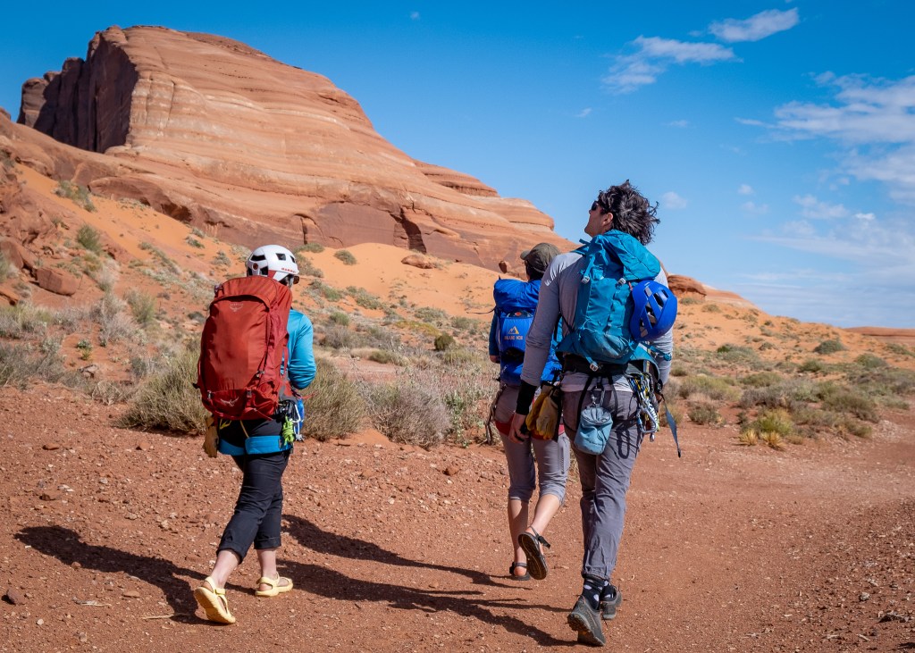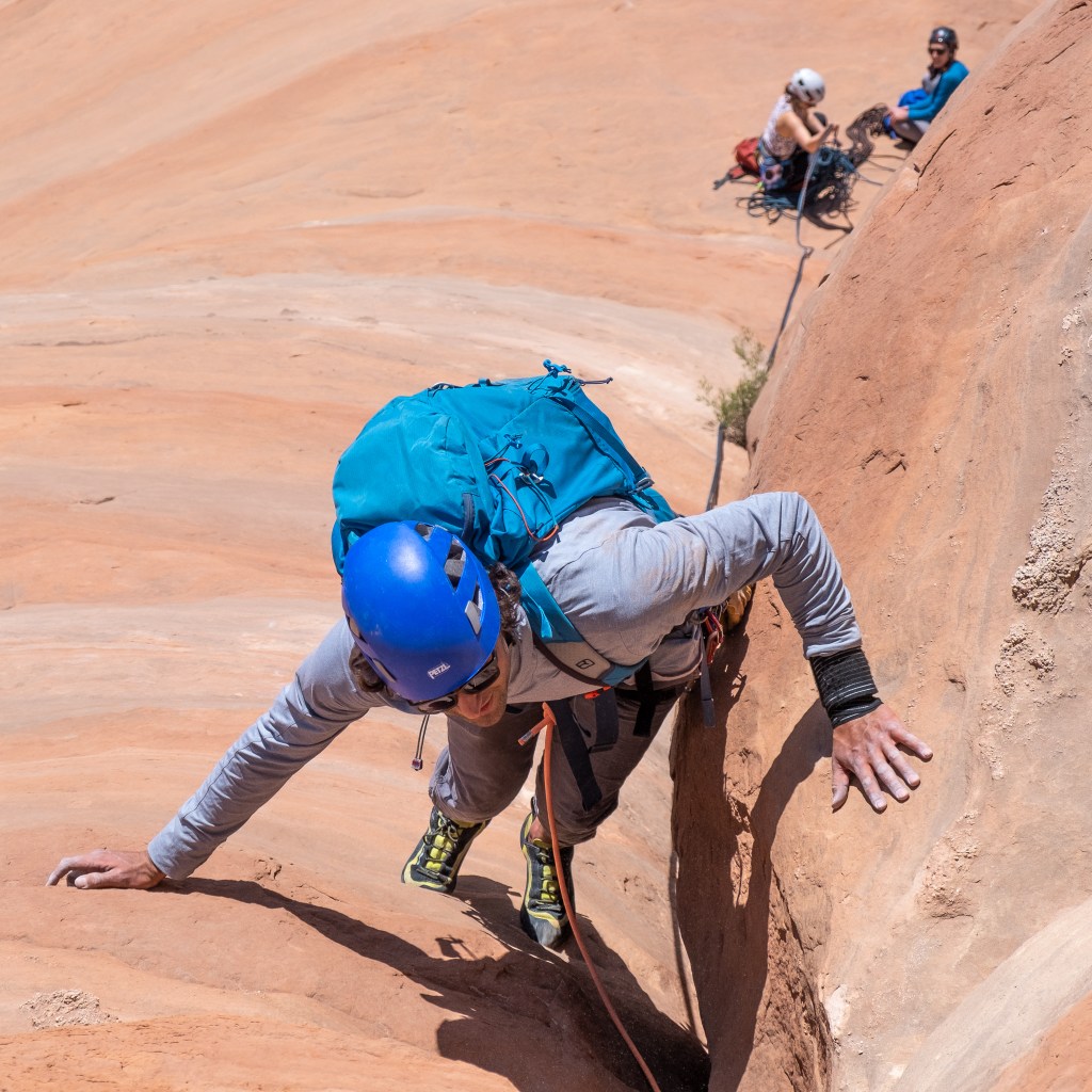Canyon Point Butte (CPB) is a beautiful sandstone buttress in the north end of Canyonlands National Park’s Needles District. Besides one 5.12 on its’ steep northern wall, the summit of the butte is typically climbed as a three pitch adventure route. Two cracks, Windy Crack and Blown Away, climb at 5.7 and 5.7R respectively. We climbed Windy Crack, which seems to be Canyon Point’s standard route. John led pitch one, a twenty foot boulder problem protected by a single bolt that gains the broad ridge separating CPB and The Sphinx. I took pitch two, which turned out to be a little more than I expected for my first traditional rock pitch of 2022. The crack is flared making the gear placements insecure, and despite reportedly high traffic, the slab on climber’s right is still quite crumbly. That said, good rests between short bouts of 5.7 friction make the 100 foot lead fairly standard. Everyone in the crew seemed to have a great time breaking in those summer legs. Above Windy Crack, a few hundred feet of third class slabbing leads to an amazing summit we were all stoked to snack on.