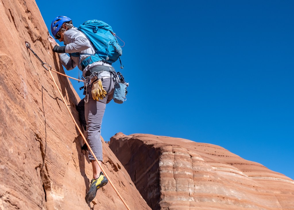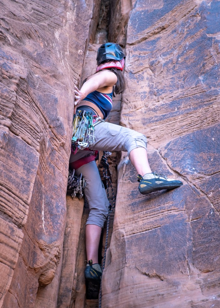 After a gentle morning on the buttes, we swung through Moab for a quick meal and Boston Celtics playoff game before continuing to Moab’s classic Wall Street climbing area. As a southeast facing cliff, Wall Street dips into the shade about 2:00PM this time of year. Despite intentions to climb elsewhere, the spectacular roadside climbing at Wall Street seduced us for the next two days. Instead of boring you with stories about single pitch climbing, we’ll end with some cliff notes. Over the course of three days Bobbi projected and logged her first ever 5.10 red-point on Arc Angel (5.10a), as well as her first 2022 trad lead on Grandma and the Green Suede Shoes (5.7). I got back on the limit trad horse with on-sight leads of Top 40 (5.8+) and Puppy Love (5.9), as well as a mixed on-sight of Lacto Mangulation (5.10b), an awesomely varied face climb ending in a off-width crack that tapers all the way through fists to thin fingers – highly recommended. John recovered his trad head after a “coulda been worse” ground fall at City Of Rocks the week before, joining Bobbi with a lead on Grandma’s, and Mila just all around crushed from slab to crack to chimney. Sure – she was on a top-rope, but Milz made Top 40 look a hell of a lot more graceful than either I or John.