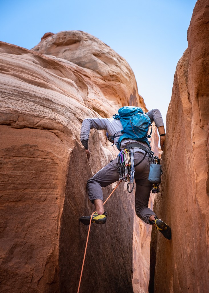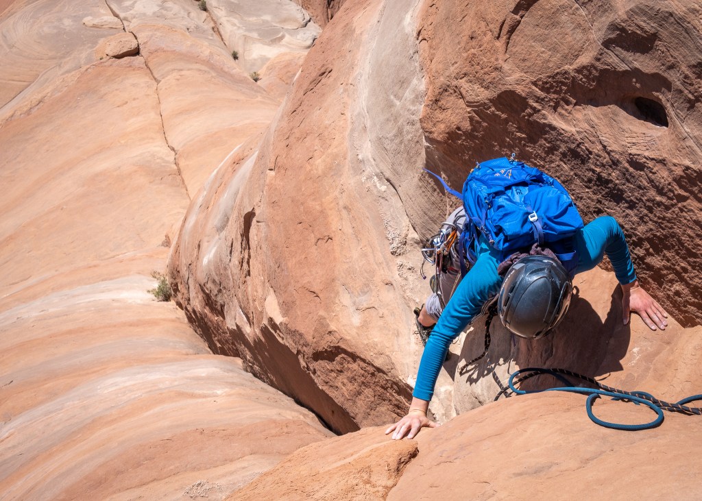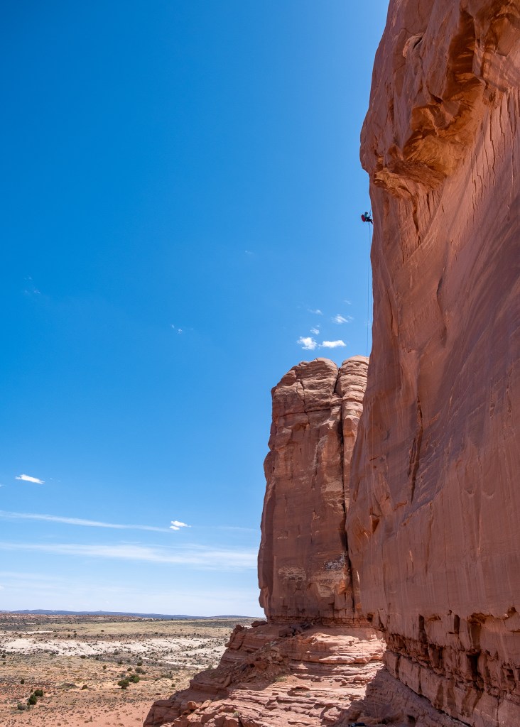 To descend CPB, we down-climbed (3rd class) to the bolted station above Windy Crack, and rappelled back to the ridge comfortably with a single 60M rope. Because the broad ridge above pitch one connects CPB to the North Ridge of The Sphinx, it only made sense to tag the shorter yet far more dramatic tower. “Rock Climbing Utah” (Falcon Guides) listed the North Ridge at 5.7, though in reality the route is comprised of a single short shimmy chimney and a moderate bolted ridge (5.4) leading to the summit – John took the lead. Per our guidebook, we made the mistake of belaying at an intermediate anchor about 80 feet below the summit, and only discovered a new set of upper bolts after sending one team member up for reconnaissance. Though the shark’s fin summit was beautiful, the major reward for climbing The Sphinx was a 180 foot (55M) free hanging rappel back to terra firma. These shots were some of the best of the trip.