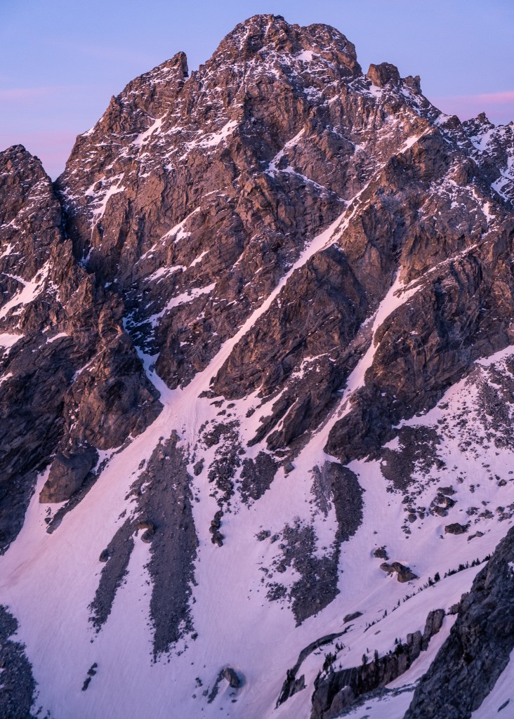 There’s something so uniquely magical about the summit of the Grand Teton. Maybe it’s the 800 feet of vertical relief above Mount Owen, the second highest peak in the range. Perhaps it’s the views that stretch as far as the eyes can see in every direction. Of course, the engaging climbing and level of commitment necessary to stand atop the mountain adds to the allure. I also stare at the beauty every single day as I go about my “real world” life, reveling as the jagged peak commands the skyline in a way no other mountain, at least in my eyes, has ever done before. The dictionary definition for grand is “magnificent and imposing in appearance, size, or style” – and I’d say that description fits seamlessly. Half my Grand Teton summits have been solitary, and while solo days certainly play a crucial role in my alpine life, sharing the rewards of such a mystical peak with a friend, especially for their first time, is an experience that resonates in a special sort of lasting frequency. To see Carl’s eyes light up at the realization of a goal he’d been building towards for three years reminded me of the first time I skied the Big Stone – the exuberance, the disbelief, the stoke – alright, time to click into some skis.