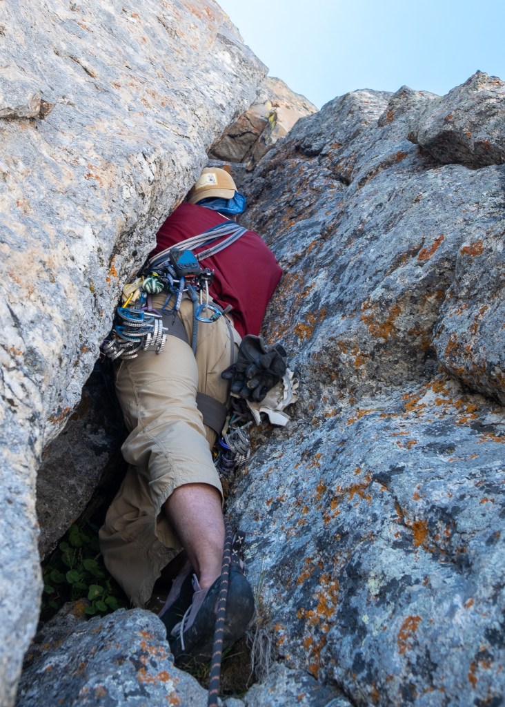 Connor took the first pitch, leading boldly through the tastefully chossy first pitch overhang and proceeding into the confines of of what TRC calls the “old-school squeeze”, a heinous, sharp, slimy and deep off-width taco which quite literally swallowed him whole and spat him out. Despite being an Indian Creek squeeze chimney aficionado, Connor just couldn’t quite squeeze into the squeeze, and without a #6-plus Camalot was unable to protect the lip of the crack. A chockstone about twenty feet up and an arm’s length deep provides the saving grace protection needed to wiggle right onto face holds, yet can only be reached by someone able to sink their full body into the crack. Demoralized and beaten by the gloriously sandbagged Chouinard off-width, Connor lowered as I stuck my neck out for the lead, hoping my Flat-Stanley-like frame might just wiggle up to that chockstone and save the day. I joked with Connor that had I done 50 more pushups that winter I wouldn’t have been able to paddle up that greased hog, but sure enough, by the literal tips of my fingers I was able to lasso the wedged chock with a double-length sling, clip it before getting digested by the meanest crack I’d ever climbed and escape right, pawing for desperate face holds on a crumbly golden slab roasting in the late morning light. I was equally flooded with relief as stricken with fear, for now I stood perched on a delicate lichen-strewn slab, fifteen feet above and ten feet right of the damned chockstone, staring down a handful of thin moves with the consequence of a major pendulum winger into the man sized fissure I’d just fought so hard to flee. “Thou shall not fall” I whispered to myself, an instinctive mantra conceived in this very moment, as I committed to a series of glassy smears on slippery quartzite crystals in pursuit of an obvious life-saving horn three arms lengths away. “Thou shall not fall… thou shall not fall… thou shall not fall…” I grasped the horn like it was the season’s first local honey crisp apple and mantled onto a secure shelf with great gear placements to reset my head. I howled at the all encompassing swath of granite overhead, and the massive sprawl of Teton Glacier hundreds of feet below, like a wild beast on a full moon. I was alive, and we were officially headed to the light.