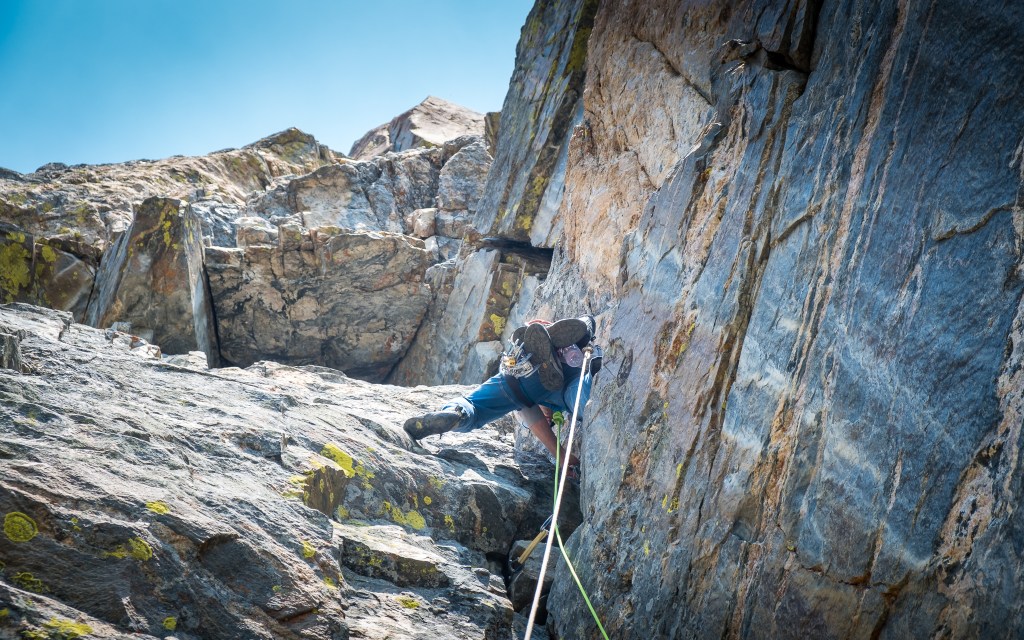 I lead the first two 5.7 pitches linked as one, an excellent warm-up with minimal rope drag and several stretches of moderate rambling. Brian was quick to follow and off into pitch three, known as the “physical” crux of the route. Though only graded 5.9, pitch three features some serious wide crack business with less than ideal protection. I am still new to the dark art of off-width climbing, and found this section quite difficult. At one point I was surely peeling from the double fist crack before snatching a bail out horn just as my feet cut, scampering up and through a jutting juggy roof and regaining my composure at the belay. The blood was flowing and the exposure was blooming – and now I had a decision to make.