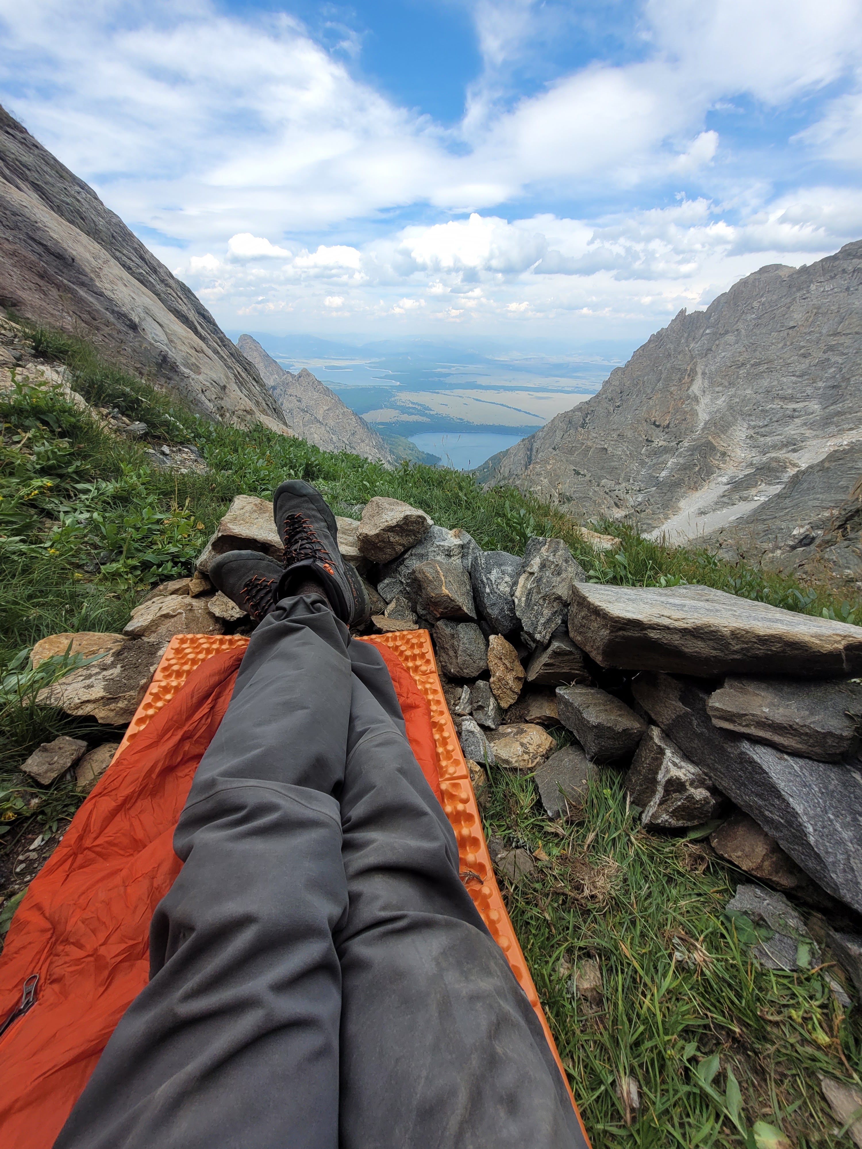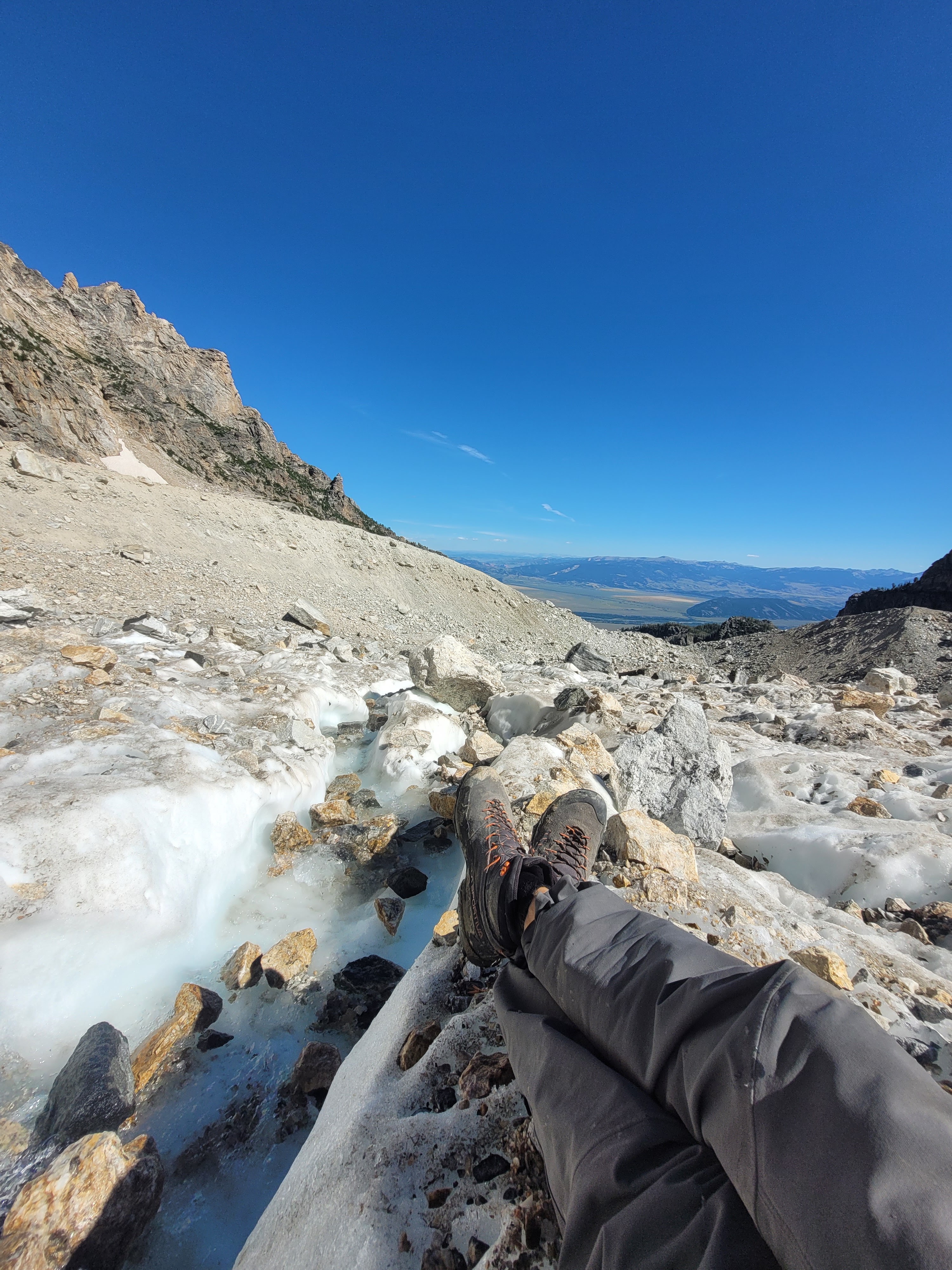 The energy atop the summit block was sublime. We had succeeded, and emerged without injury. Two Cathedral Traverse candidates joined us for photos, and after a short celebration we made no haste in expediting our descent. We reached the SE Face of Mount Owen via two 25M rappels south of the summit block, and enjoyed dry conditions for the remainder of the Koven Route. We probably could’ve stashed the rope for the weekend, but given our extreme fatigue and lack of calories we made use of nearly every rappel station we came across. We used two rappels for descent down the lower east ridge and about seven in the Koven Couloir, which still involved plenty of spicy 5th class down-slabbing. Teton Glacier was melted beyond the requirement of axes or crampons. We followed the guidebook recommendation to traverse ascend the lower north face of Disappointment Peak from Glacial Gulch to Amphitheater Lake, of which we were not disappointed. This retreat strategy involved minimal vertical gain and saved us a sizeable chunk of talus hopping to Delta Lake. We returned to the parking lot around 5:30PM, some 63 hours after leaving South Jenny Lake on Saturday. Shoutout to Hillary from Jackson for giving us two ProBars each at Surprise Lake, for putting a dent in our multi-thousand calorie deficit – I cannot wait to return the favor.