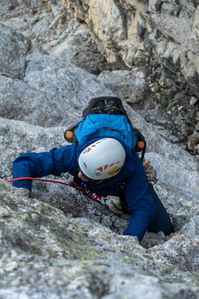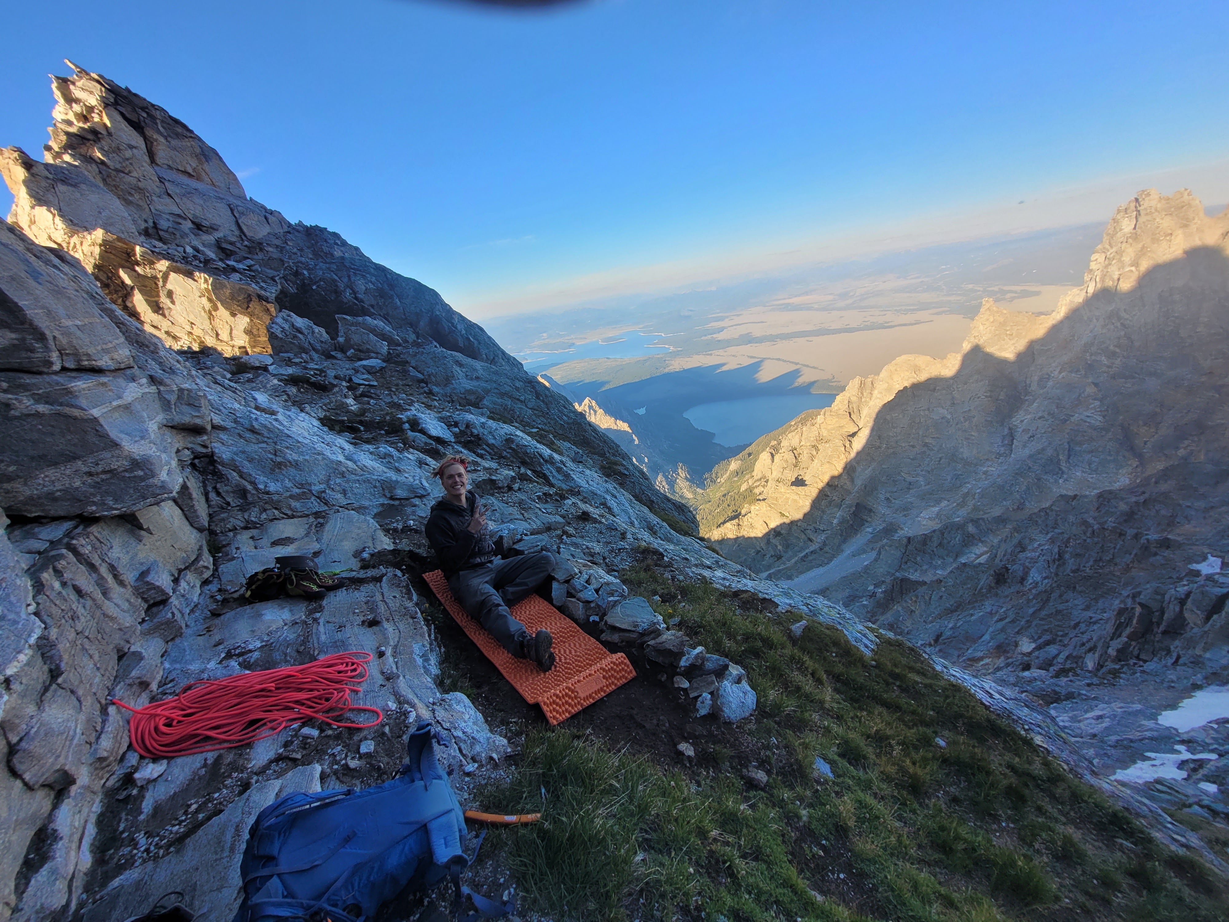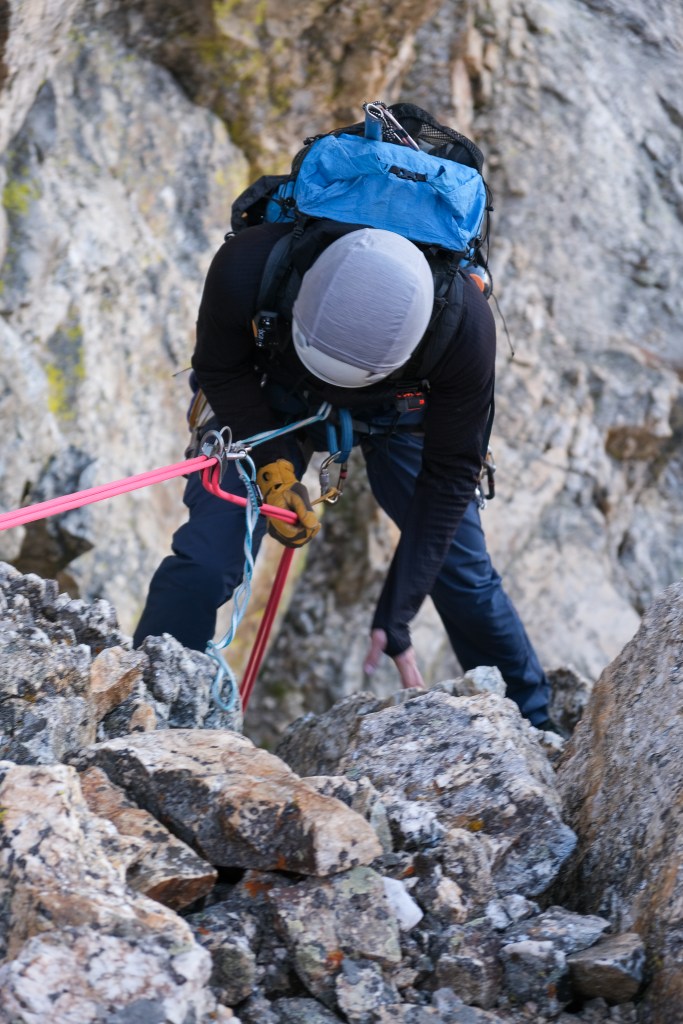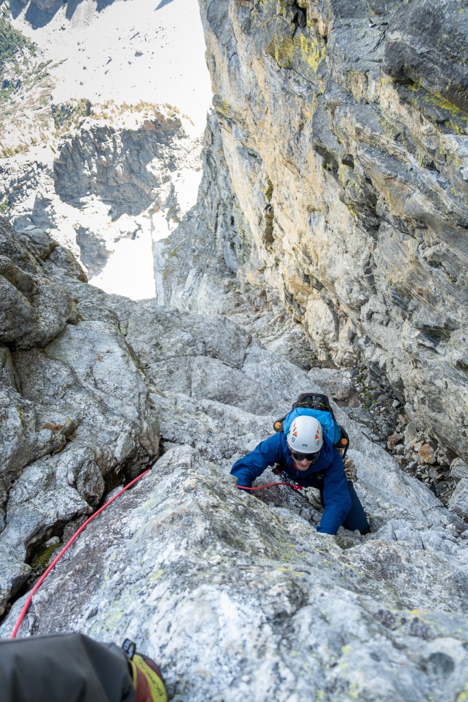 After six hours of building sleeping platforms and wind walls, refilling water and hiding in our plastic body bags, we barely overcame the weather for a pot of boiling water, enjoyed a warm meal and tucked in for the evening. Sleep came in bouts, interrupted by the machine-gun-esque ripples of the bivi-sack every time father wind had an outcry. The sunset over Mount Teewinot and Jenny Lake was spectacular, and the morning glow of sunrise even more breathtaking, especially knowing we were sleeping at the literal toe of the North Ridge – no approach required. We climbed the fixed line by headlamp the following morning, retrieved our stashed metal implements from the day before and tied in for the first of 11 North Ridge pitches by first light.