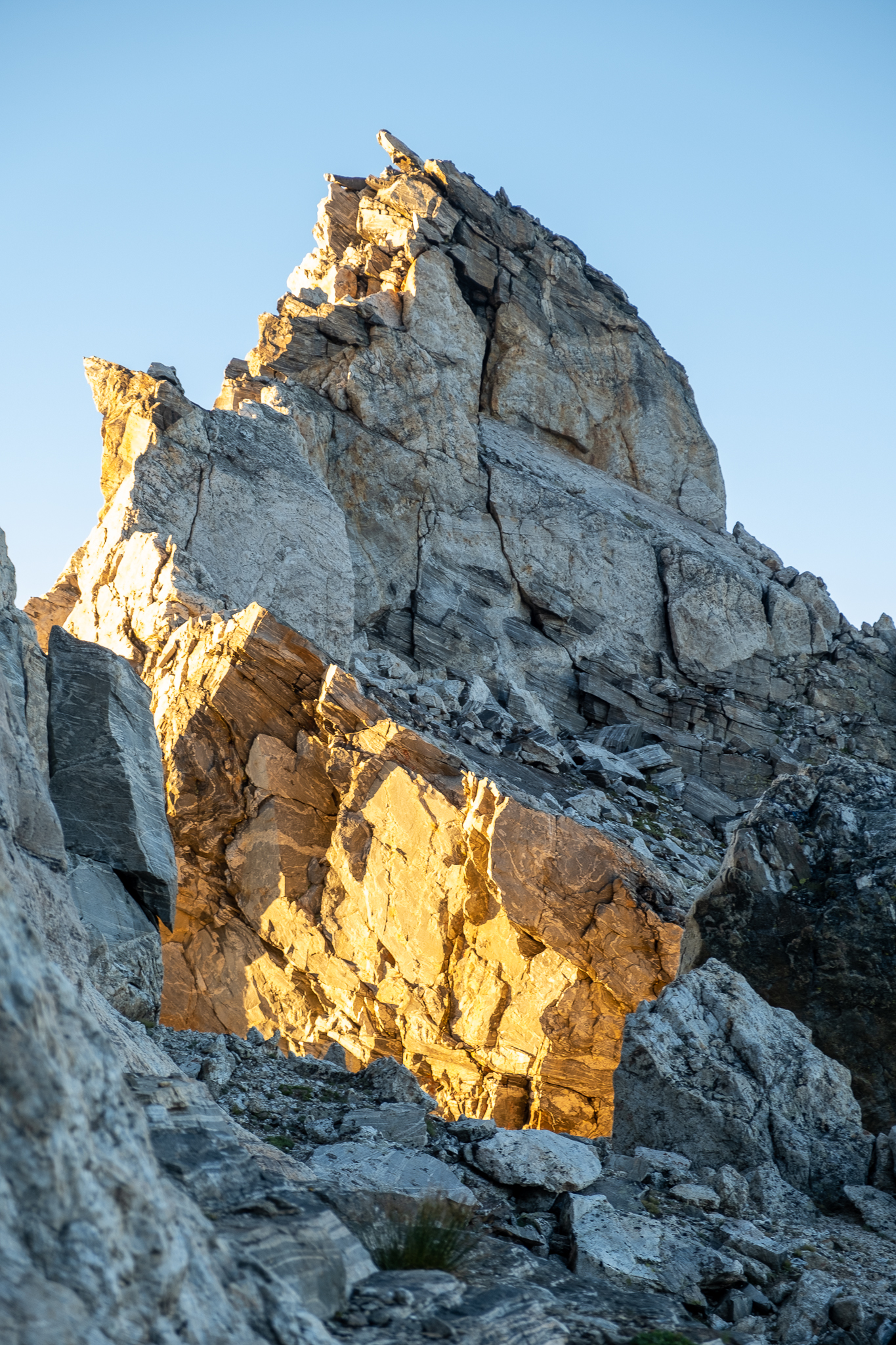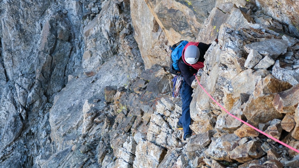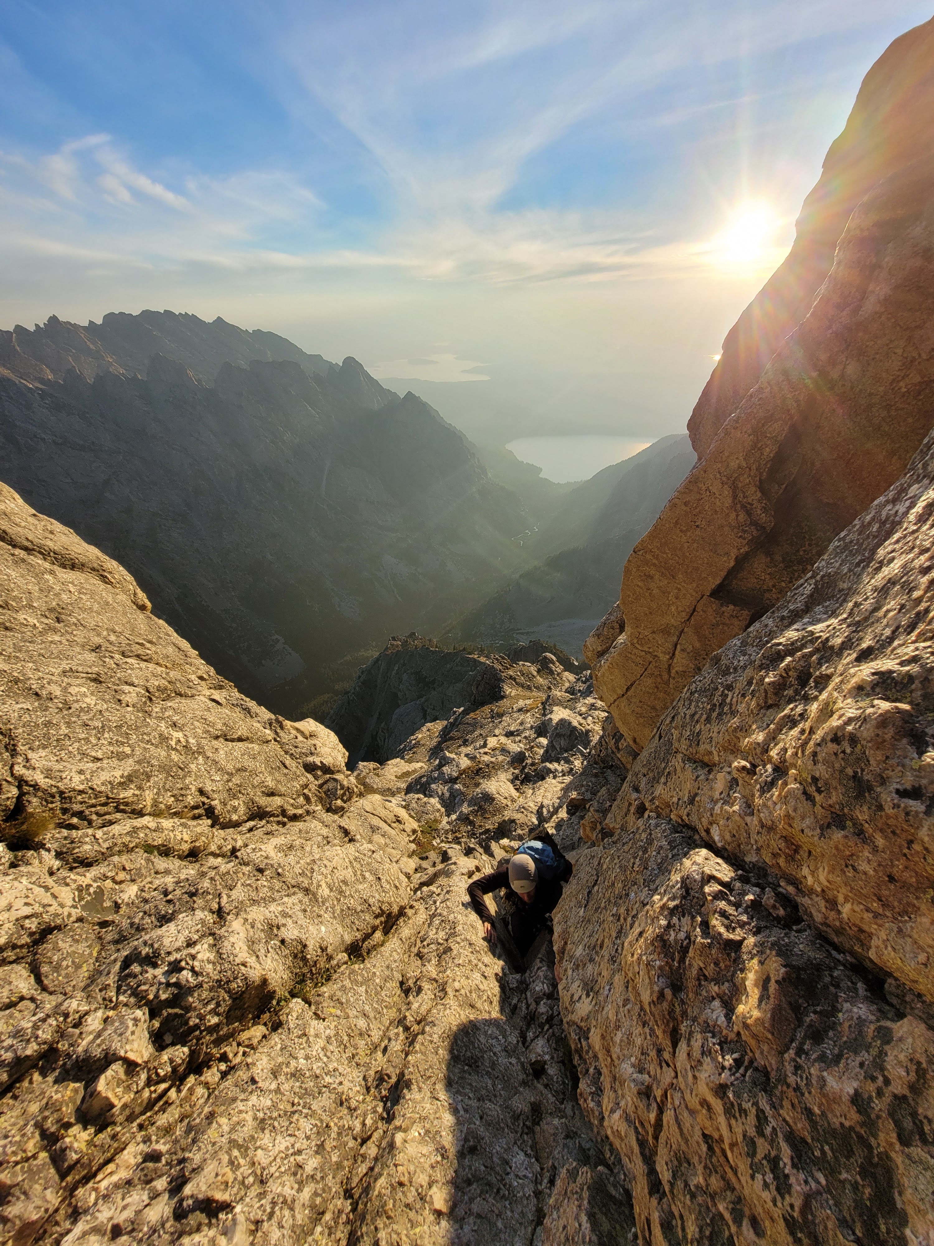 After six hours of building sleeping platforms and wind walls, refilling water and hiding in our plastic body bags, we barely overcame the weather for a pot of boiling water, enjoyed a warm meal and tucked in for the evening. Sleep came in bouts, interrupted by the machine-gun-esque ripples of the bivi-sack every time father wind had an outcry. The sunset over Mount Teewinot and Jenny Lake was spectacular, and the morning glow of sunrise even more breathtaking, especially knowing we were sleeping at the literal toe of the North Ridge – no approach required. We climbed the fixed line by headlamp the following morning, retrieved our stashed metal implements from the day before and tied in for the first of 11 North Ridge pitches by first light.
