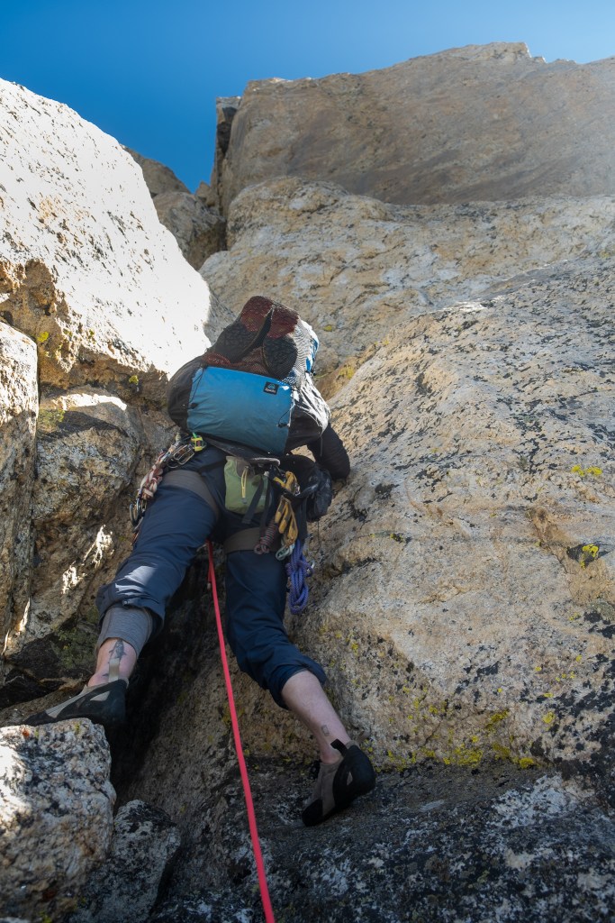 Day three began with a less than satisfying breakfast of bone chillingly cold electrolyte powder, half a frozen RX Bar and half a vanilla GU gel, some route finding difficulties and several hundred feet of fifth class soloing in gullies east of the ridge, until eventually reaching the notch separating the Serendipity Arete and the final tower of the North Ridge. The route’s crux, a mean looking 5.9 OW with scanty gear, stared directly back at us. On any other day I would’ve been stubbornly dancing with the greased hog, pursuing the nebulous virtue of aesthetic purity, but with only 200 calories in both our pockets there was no more time to waste. To avoid the OW, a short 30 foot rappel from a slung boulder took us back onto the shady west face, where we traversed south and climbed two more pitches of generally easy fare, though precariously loose, to the second pitch of the upper Koven Route, the famous “elevator shaft” Koven Chimney and ultimate summit. No rock shoes were needed on day three, for which our numb toes were grateful.