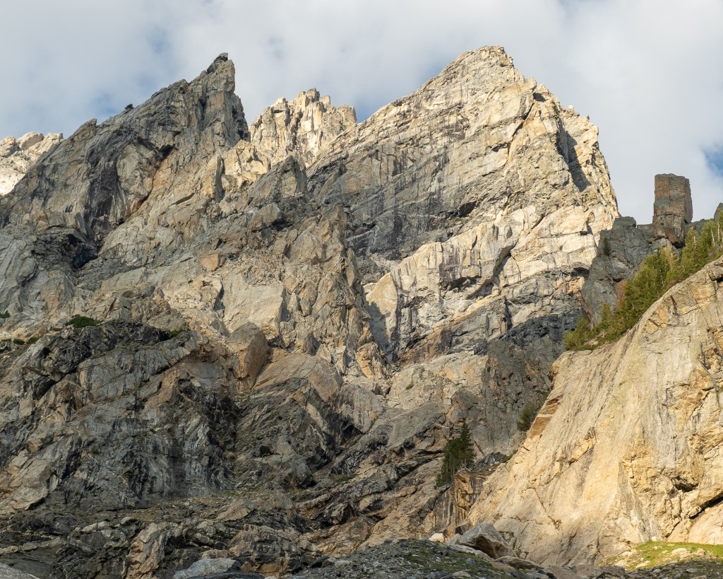 Climbing the North Ridge of Mount Owen represented a serious notch in my Teton alpine climbing belt. I had never come close to attempting anything of its’ magnitude, and had the true extent of the business been known I may have looked elsewhere for weekend recreation. Liam Wiley and I packed for a two day outing – summit on day one with a bivouac somewhere along the Koven Route, and descent to Lupine Meadows on day two. After mutual fits of sleeplessness confirmed via text message at 1:05AM, we met an hour early and were walking from the South Jenny Lake trailhead by 3:45. A crystal clear sky showed no signs of the 50mph winds forecasted later that Saturday as we marched along the starlight shores of Jenny Lake into Cascade Canyon. We crossed Cascade Creek following old GPX tracks from my past ski tours in the Owen-Teewinot cirque, just upstream of the main drainage. Liam kept shoes on and paid the price, pitching from a mossy log into the drink only yards from the shore. Luckily the creek was running quite low, perhaps only knee thigh deep, but 4:30AM on a 45 degree late August morning is no time for a soak. I promptly popped off my footwear and waded across. The bushwhack from Cascade Creek into the cirque proved all-time masochist, a battle against mountain hardened Amazonian overgrowth barely suitable for snakes. Progress was slow as we battled up the steep hillside, seemingly inches by the minute. Intermittent boulder fields provided some relief, but ultimately the game was three hours of puff n’ grunt, thorn bushes, mossy slabs and all, rubbing our minds raw as sandpaper. The only consolation prize? Wild raspberries – and plenty of them – yes