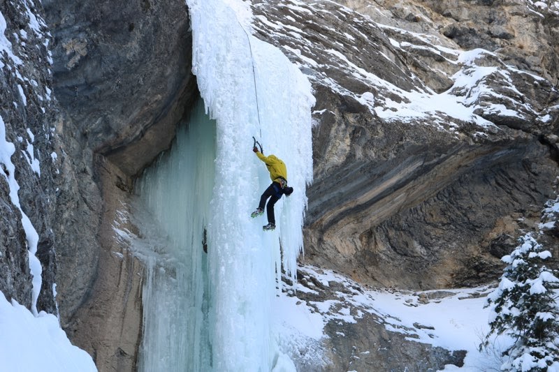 If planning to climb either of these two routes, ice screws should be the only warranted protection in normal conditions. If the Squash Head pillar is not touching the ground, two hardish bolted mixed routes can be climbed or aided on the left side of the cave to access the upper flow (more information on Mountain Project). Bolted anchors are available on climber’s left above the first and second pitches of Squash Head. Bolted anchors available on climber’s right above pitch one (below and right of the main flow), and climber’s left above pitch two, on Backoff. Extra small screws and stubbies may be helpful on Backoff. Descent from both routes can be made with a 60M rope and v-threads, though two ropes would avoid the need for any threads. The rappel from the top of Squash Head to the base of Backoff can be made with a single 60M rope.