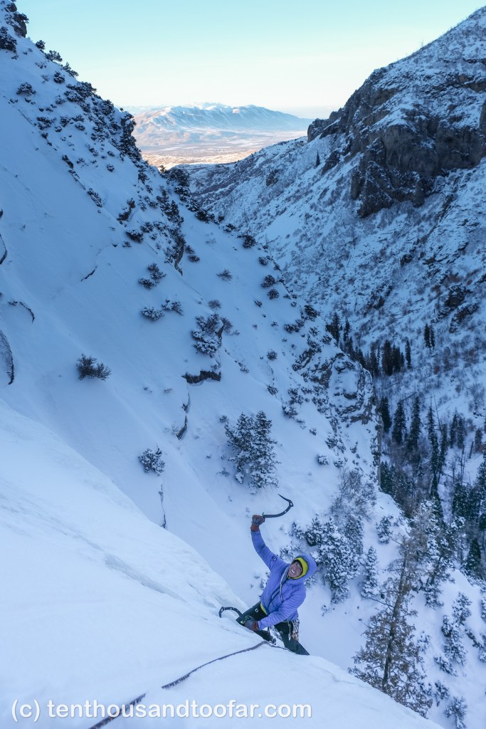 Sunday the 18th I was ticketed for a family Christmas visit to Los Angelenos – five days of sunny skies, beaches, late nights and first world eats – so I just HAD to get out and smash some icicles along the way. After skiing the Four Hour Couloir in Grand Teton National Park the day before, I drove a fully loaded van five hours south to the bustling metropolis of Salt Lake City, Utah. I messed up my blanket beta, tossed and turned my way through a frosty night of sleep in the Smith’s parking lot and found myself with local Utahn ice man Colten Moore in Santaquin Canyon the following morning. Per his suggestion, our plan was to link up two classic WI4 routes, Squash Head and Backoff, by way of a fancy ridge scramble and rappel situation – totaling over 200M of technical ice. I was psyched – not only to log more mileage on steep ice in a new-to-me setting, but also to beat every last ounce of nervous energy from my body before gearing up for a day of air travel.