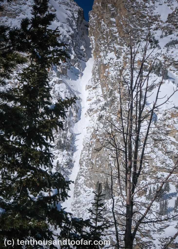 NOTE ON AVALANCHE CANYON ICE CLIMBING: I looked hard for any signs of climbable ice in Avalanche Canyon, but saw nothing besides the moderate curtain that sits directly below the “Elevens” on Mount Wister’s eastern shoulder. It’s also no surprise the Elevens are nowhere close to skiable condition. There’s supposed to be some worthwhile WI4 pillar that forms just east of the southeast avalanche path on Shadow Peak, but I couldn’t find it!